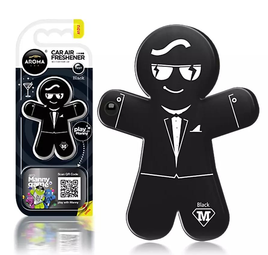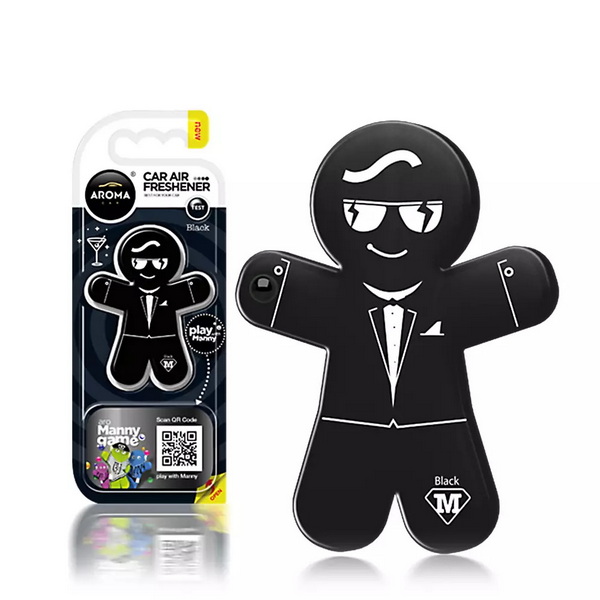 929935 Ароматизатор Aroma Car Manny BLACK. Ультрасучасний полімерний ароматизатор повітря Aroma Car із серії Manny, виконаний у формі чоловічка, необхідно використовувати на решітці вентиляції в салоні автомобіля. Ароматизатор можна застосувати як ароматизований брелок для ключів, як прикраса для сумочки, рюкзака або як оригінальний ароматизатор для гардероба, для цього в комплекті передбачено пластикове кільце. Ароматизатор має приємний аромат Black (Чорний).