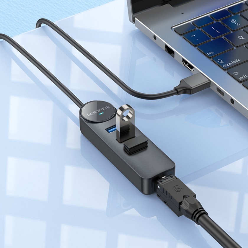 Адаптер Borofone DH6 Erudite 4-in-1 Gigabit Ethernet Adapter(USB to USB3.0*3+RJ45)(L=1.2M) Black призначений для підключення домашнього ПК або ноутбука до локальної дротової мережі Ethernet через вільний порт USB-A.