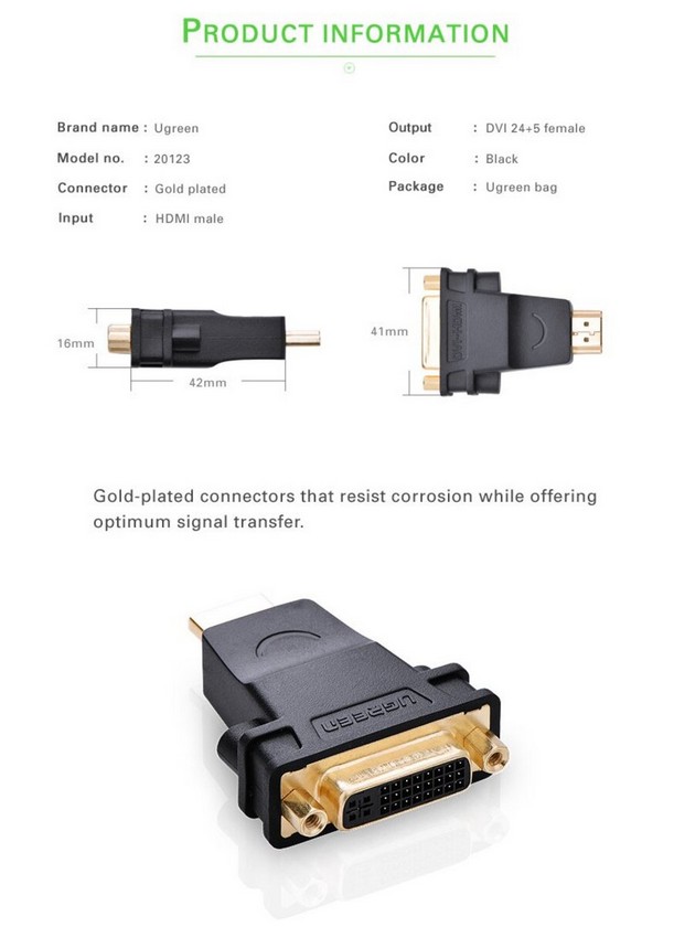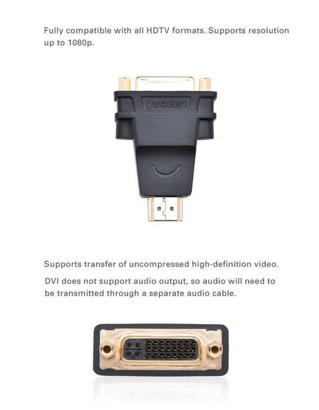 UGREEN HDMI Male to DVI (24+5) Female Adapter (Black) (UGR-20123) — високошвидкісний перехідник, який дозволяє підключати пристрої-джерела, оснащені HDMI, такі як ноутбук/робочий стіл, Blu-Ray, Xbox 360, PS3, Apple TV, DVD та телеприставку до телевізора високої чіткості з підтримкою DVl, дисплеїв або проекторів з існуючим кабелем DVI (не входить до комплекту).