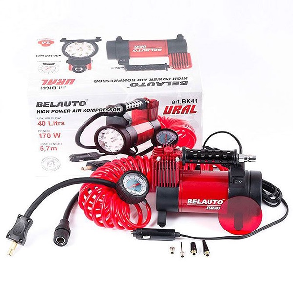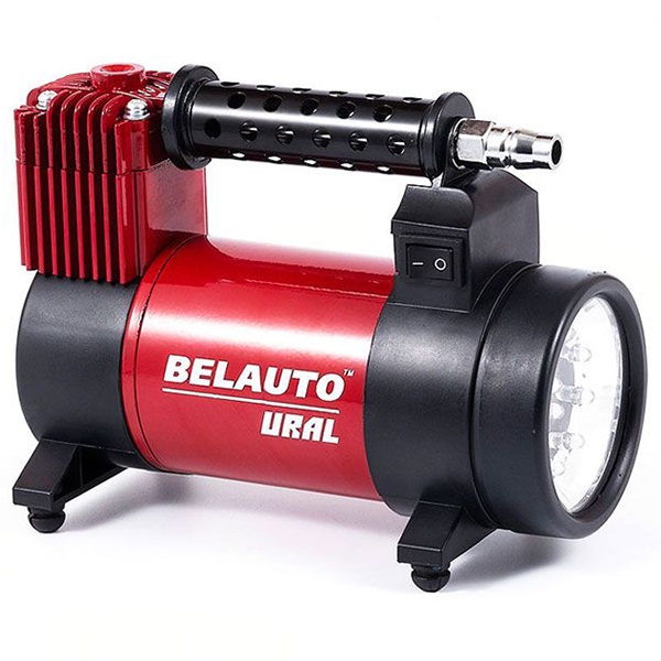 БЕЛАВТО Компресор автомобільний УРАЛ з LED ліхтарем. 12В, 10 Атм, 40 л/хв., довжина шланга 5,7м, кабеля 3м, штекер прикурювача з запобіжником, сумка, адаптери