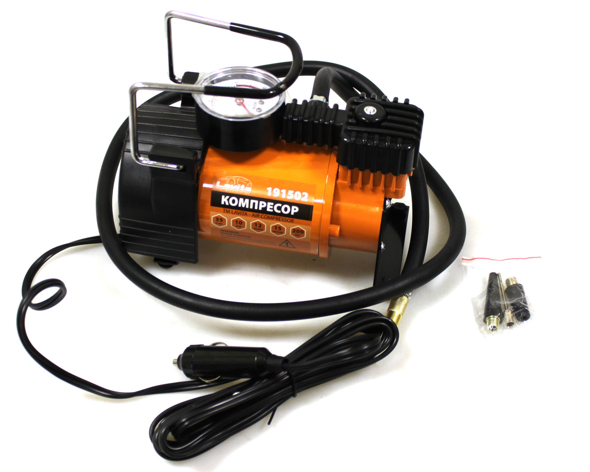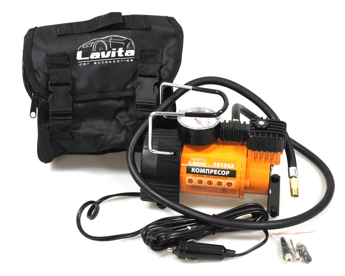 Компресор призначений для накачування повітрям шин автомобілів. Також в комплект входять насадки для накачування м'ячів, матраців, човнів і шин велосипедів. Електроживлення даної моделі здійснюється через гніздо прикурювача автомобіля. Сумка-чохол для зберігання і транспортування входить в комплект. Увага - компресор Lavita LA 191502 розрахований на підключення до прикурювача, однак його потужність і струм: 160 Вт і до 15 А. Зустрічаються прикурювачи, розраховані на 120 Вт і 10 А, при підключенні до них подібного компресора може перегоріти запобіжник. Тому перед покупкою компресора Lavita LA 191502 слід перевірити свій прикурювач і максимальний струм, на який розрахований його запобіжник.