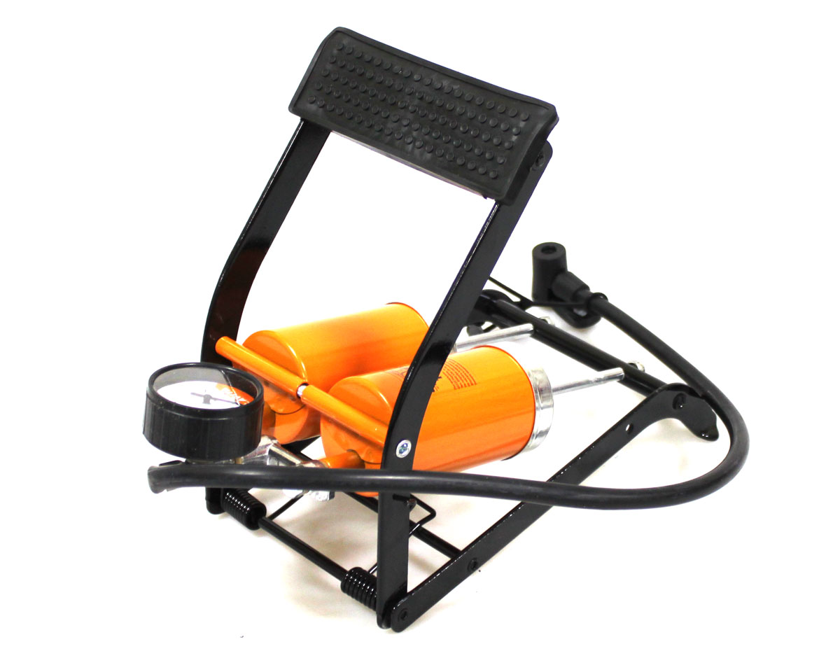Насос ножнийі двоциліндровий, має металевий корпус, оснащений манометром для контролю за тиском повітря в шині. Насоси двоциліндрові швидко накачують шину, але вимагають підвищеного зусилля при натискання на педаль ногою. Покриття педалі виготовлено з протиковзкої і зносостійкої гуми, для додаткової стійкості, у насоса передбачені гумові ніжки. Насос комплектується перехідниками.