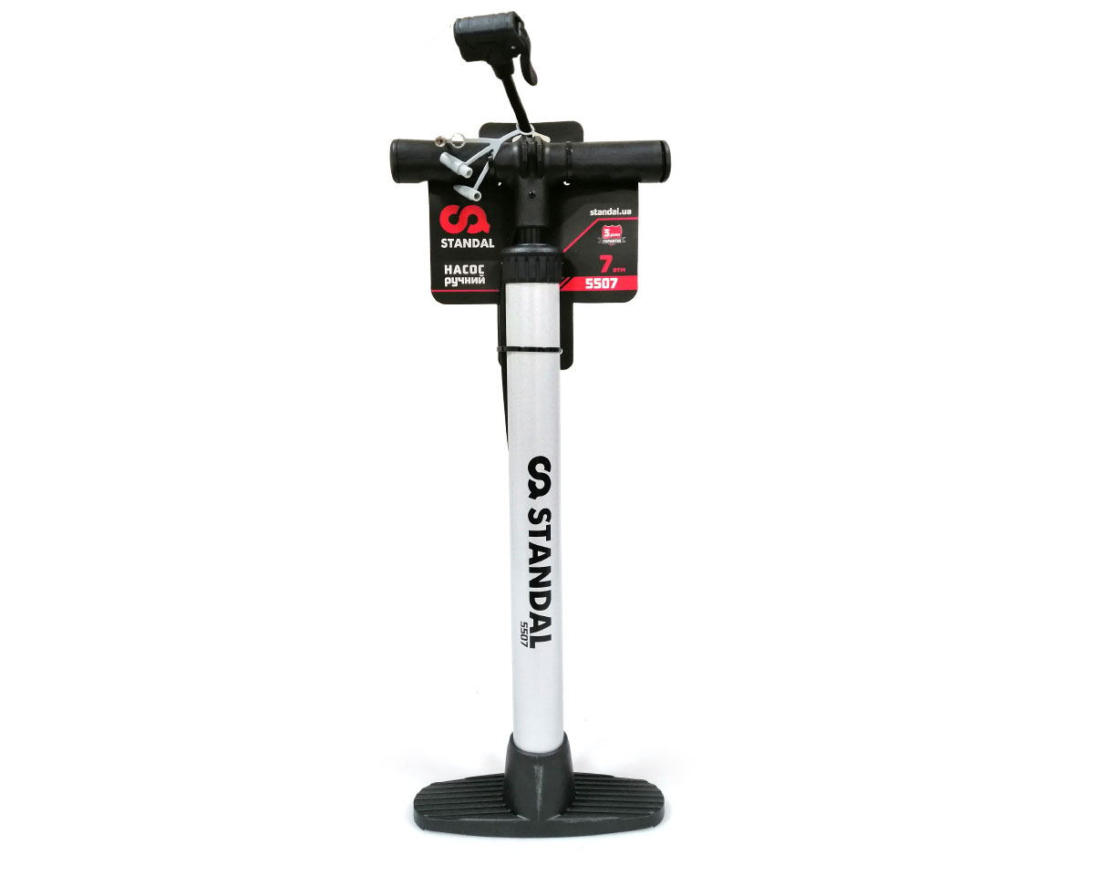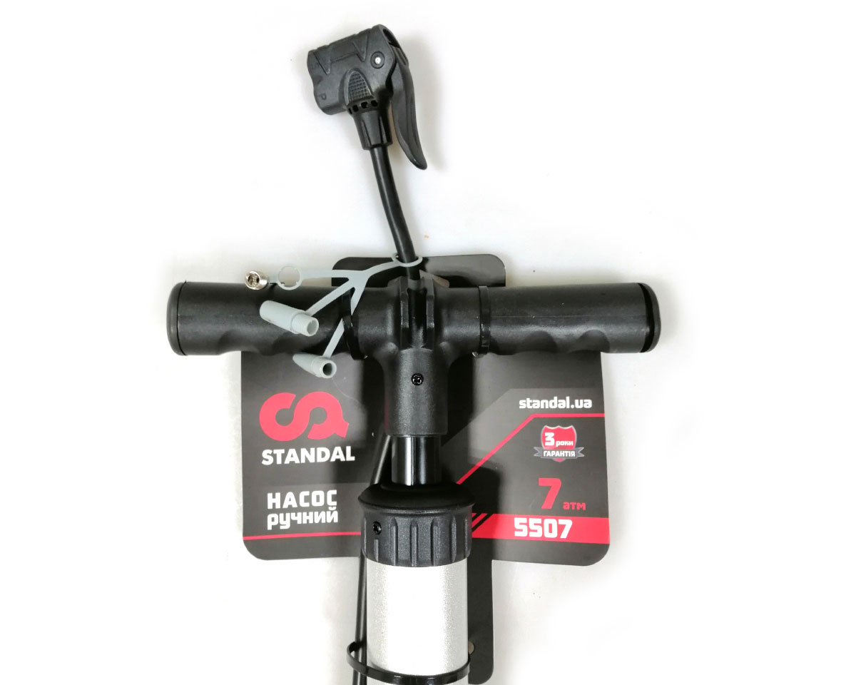 Ручний насос STD 5507, TM Standal – незамінний пристрій для вашого транспортного засобу, а також для вашого дому. За допомогою цього насоса можна дуже легко накачати повітрям різноманітні шини, включаючи автомобільну, або велосипедну шину, гумовий човен, або звичайний футбольний дитячий м'яч. Найважливіший показник – це нормальний тиск у шинах, який забезпечить водієві безпечну та зручну поїздку. Для безпечної їзди на транспорті рекомендується постійно перевіряти тиск у шинах, що також дозволяє запобігти передчасному зношенню шин, покращити зчеплення з дорогою, зменшити витрату палива. Насоси поділяють на однопоршневі та двопоршневі. Наявність другого поршня істотно впливає на швидкість накачування і продуктивність насоса. Цей однопоршневий ручний насос моделі STD 5507 впорається з усіма необхідними завданнями. Корпус виконаний з високоякісного та міцного металу, що забезпечить тривалий термін використання. Розмір циліндра становить 43 мм х 450 мм, дозволяючи нагнітати великий об'єм повітря за один цикл. Насос укомплектований міцним гумовим шлангом, який легко кріпитися та знімається з вентиля колеса. Даний насос призначений для велосипедів, автомобілів, та човнів. Максимальний тиск даної моделі складає 7 АТМ.