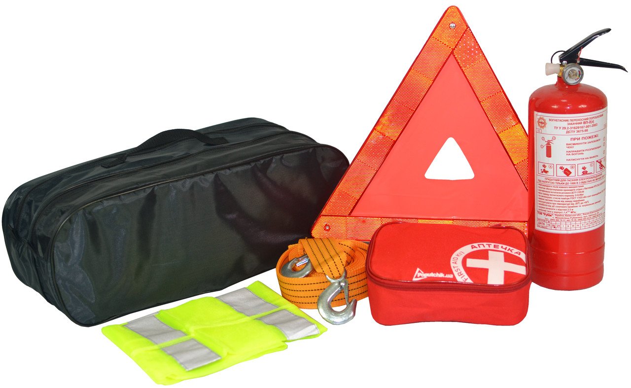 Комплектація: Трос буксирувальний 2 т 4 м з крюками Знак аварійної зупинки в пластиковому пакуванні Автомобільна аптечка згідно ДСТУ (02-021-М), в м'якому футлярі Вогнегасник порошковий 2 кг Сумка чорна, на два відділення 50 х 18 х 18 см Жилет безпеки світловідбиваючий Інструкція з використання