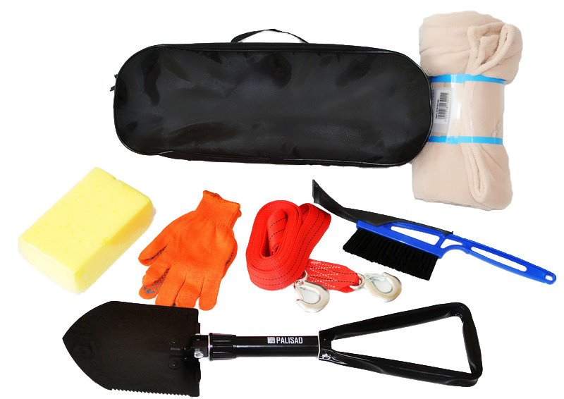 Комплектація: Трос буксирувальний 2 т 3 м з крюками Сумка чорна, з двома відділеннями 50 х 18 х 18 см Рукавички текстильні з ПВХ Губка 19 х 12 х 6 см Плед фліcовий універсальний 125 х 150 см Лопатка саперна складана металева 60 см Щітка-скребок з ручкою, довжина 45 см Інструкція з використання