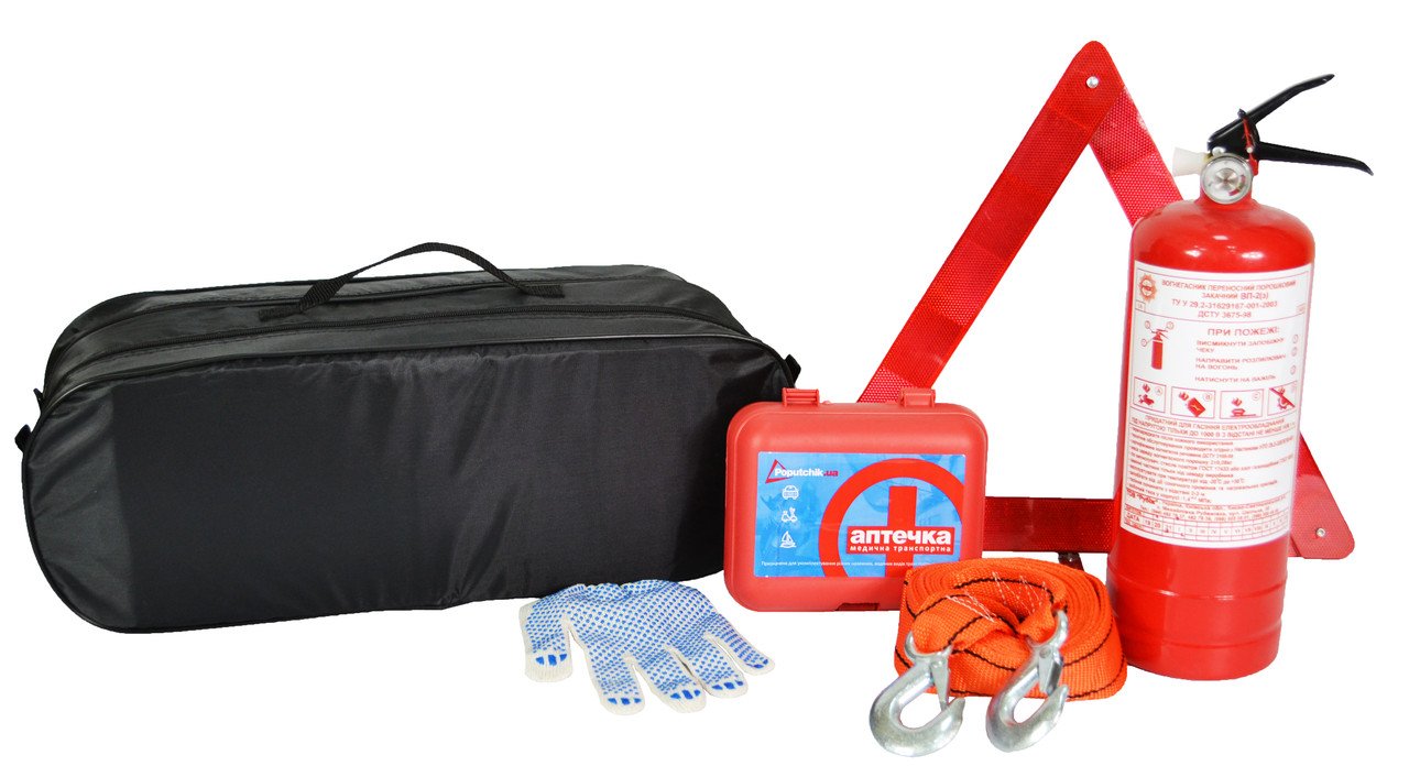 Комплектація: Трос буксирувальний 2 т 4 м з крюками Знак аварійної зупинки в картонному пакуванні Транспортна аптечка згідно ТУ (02-003-П), в пластиковому футлярі Вогнегасник порошковий 2 кг Рукавички з ПВХ універсальні Сумка чорна, на два відділення 50 х 18 х 18 см Інструкція з використання