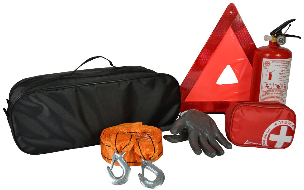 Комплектація: Трос буксирувальний 8 т 5 м з крюками Знак зупинки в пластиковому футлярі Автомобільна аптечка згідно ТУ (50-006-М-IS), в м'якому футлярі Вогнегасник порошковий 2 кг Рукавиці з нітриловим покриттям Сумка чорна, на два відділення 50 х 18 х 18 см Інструкція з використання