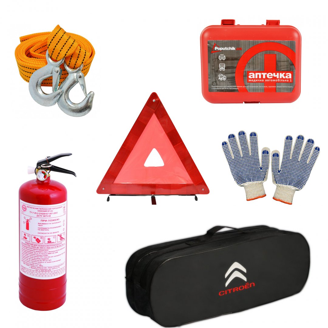 Набір автомобіліста "Citroёn". Комплектація: Трос буксирувальний 2 т 3 м з крюками Знак аварійної зупинки Автомобільна аптечка в пластиковому футлярі Вогнегасник порошковий 2 кг Рукавиці ПВХ універсальні Сумка чорна, на два відділення 50 х 18 х 18 см Інструкція з використання Термін експлуатації вказаний по кожній позиції окремо Сертифікації підлягають окремі складові