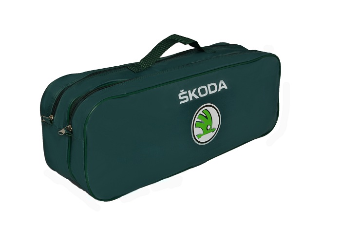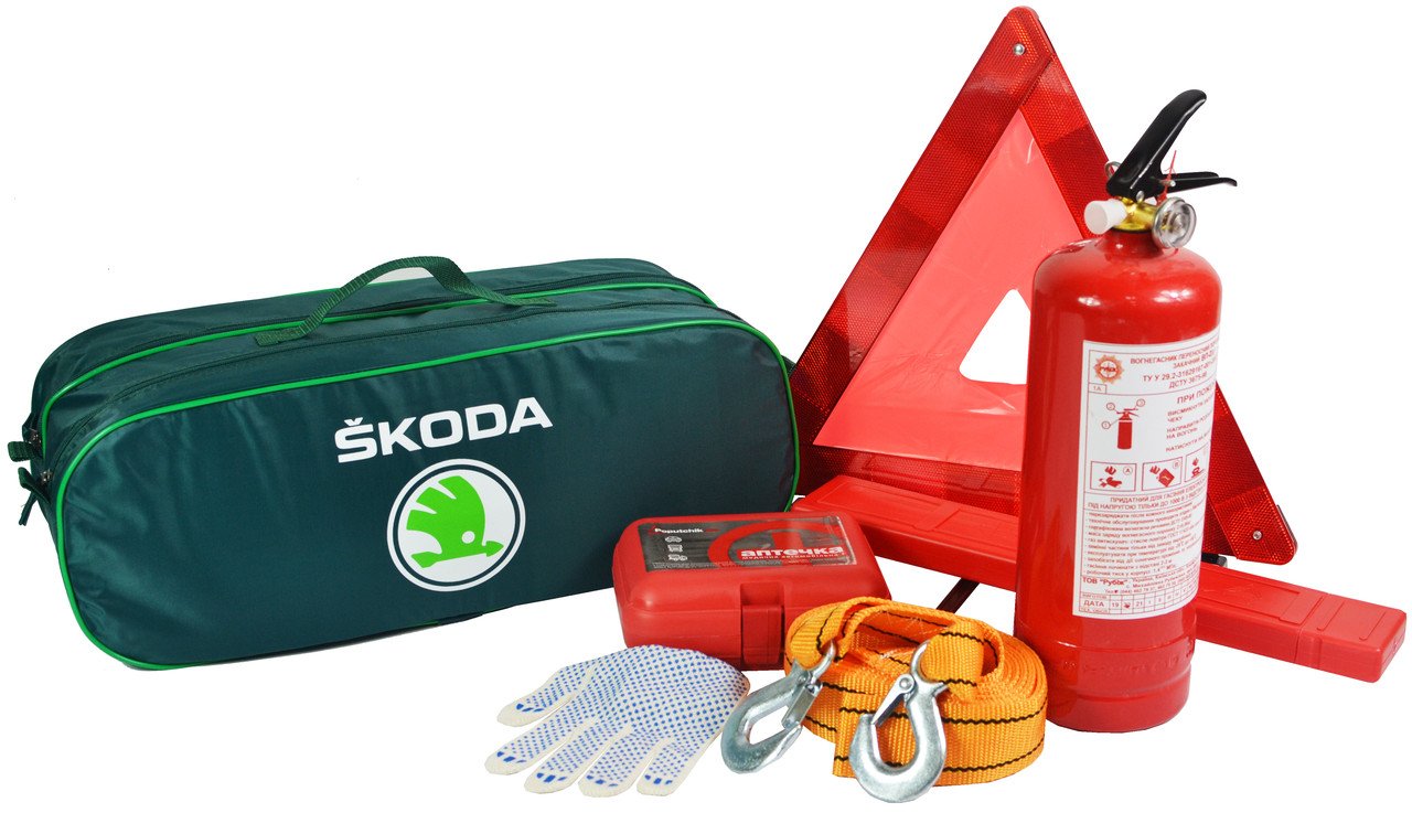 Набір автомобіліста "Skoda". Комплектація: Трос буксирувальний 2 т 4 м з крюками Знак аварійної зупинки в пластиковому футлярі Автомобільна аптечка в пластиковому футлярі Вогнегасник порошковий 2 кг Рукавиці ПВХ універсальні Сумка зеленого кольору, на два відділення 50 х 18 х 18 см Інструкція з використання Термін експлуатації вказаний по кожній позиції окремо Сертифікації підлягають окремі складові