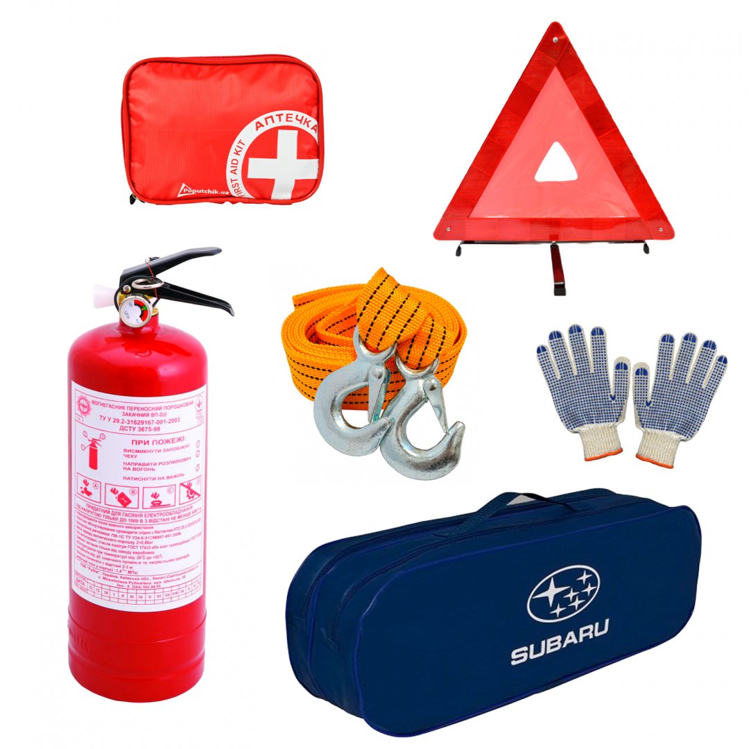 Набір автомобіліста "Subaru". Комплектація: Трос буксирувальний 2 т 3 м з крюками Знак аварійної зупинки Автомобільна аптечка в м'якому футлярі Вогнегасник порошковий 2 кг Рукавички текстильні з ПВХ Сумка синього кольору, на два відділення 50 х 18 х 18 см Інструкція з використання Термін експлуатації вказаний по кожній позиції окремо Сертификації підлягають окремі складові