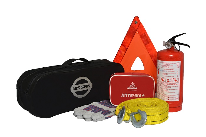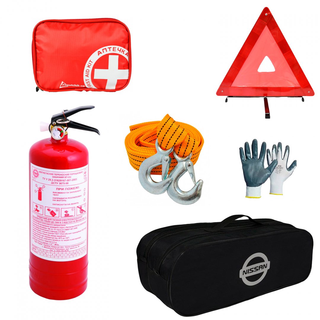 Набір автомобіліста "Nissan". Комплектація: Трос буксирувальний 5 т 5 м з крюками Знак аварійної зупинки Автомобільна аптечка в м'якому футлярі Вогнегасник порошковий 2 кг Рукавиці з нітриловим покриттям Сумка чорного кольору, на два відділення 50 х 18 х 18 см Інструкція з використання Термін експлуатації вказаний по кожній позиції окремо Сертифікації підлягають окремі складові