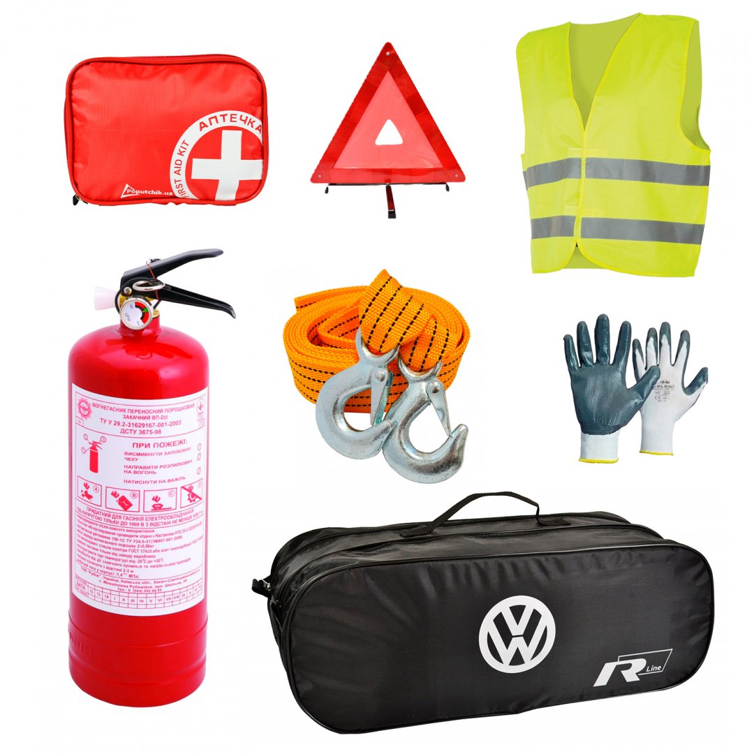 Набір автомобіліста "Volkswagen R-Line". Комплектація: Трос буксирувальний 2 т 3 м з крюками Знак аварійної зупинки Автомобільна аптечка в м'якому футлярі Вогнегасник порошковий 2 кг Рукавиці з нітриловим покриттям Сумка чорного кольору, на два відділення 50 х 18 х 18 см Жилет безпеки світловідбиваючий Інструкція з використання Термін експлуатації вказаний по кожній позиції окремо Сертифікації підлягають окремі складові