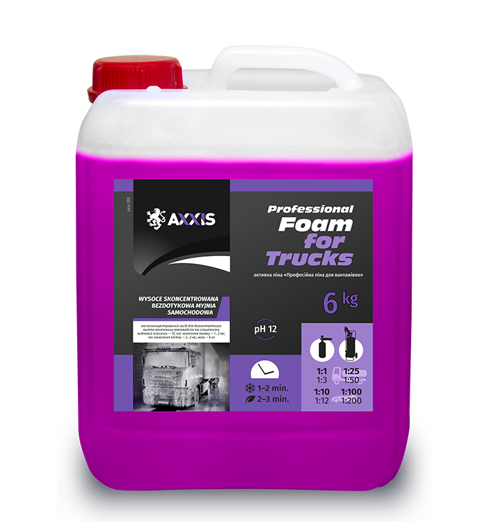 Висококонцентрований засіб для безконтактного миття автомобілів. В тому числі спецтехніки, вантажних та комерційних автомобілів. Засіб спеціально розроблений для усунення стійких забруднень тентів, автоцистерн чи вантажного автотранспорту. Оптимальний для видалення дорожнього бруду, пилу забруднень від нафтопродуктів. Засіб зберігає ефективність при роботі в умовах низьких температур і в холодній воді. Містить антикорозійні добавки.