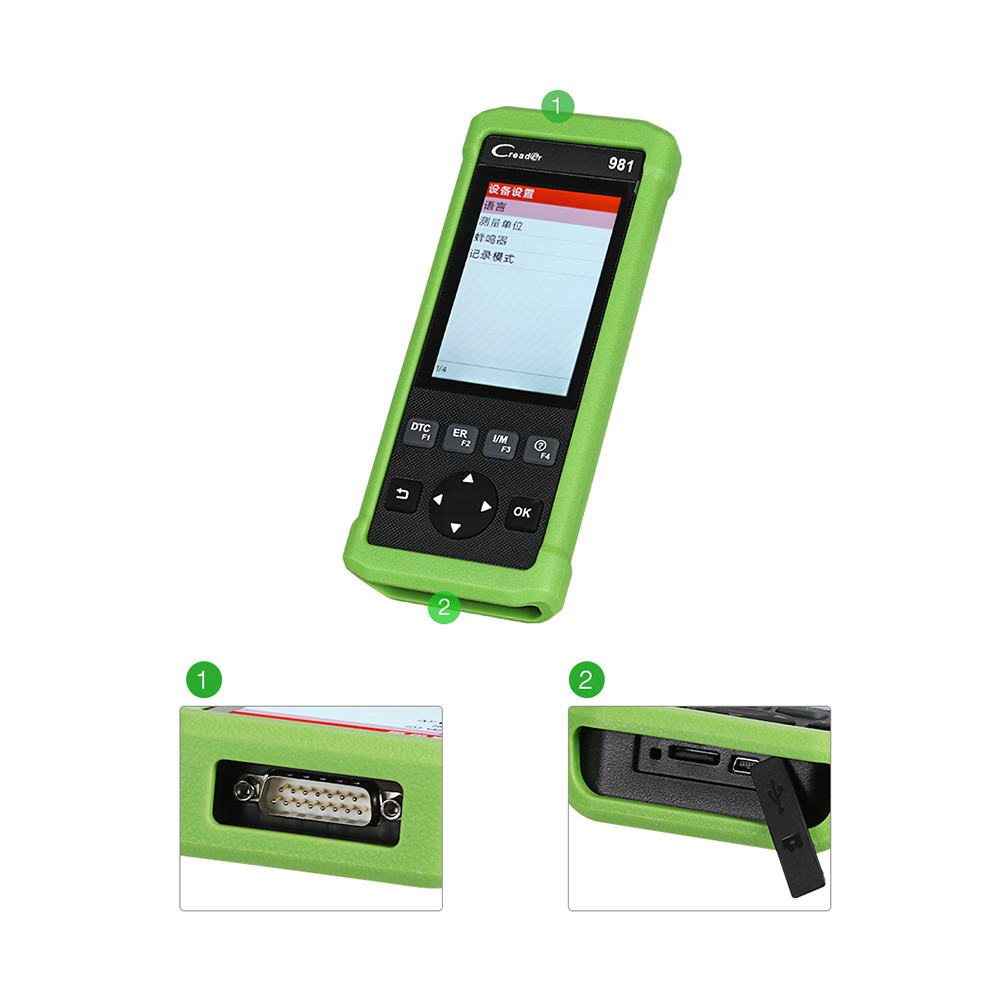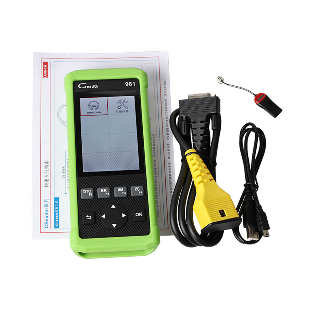 Creader 981 – це потужний діагностичний сканер нового покоління від компанії LAUNCH для обслуговування європейських, американських та азіатських марок автомобілів. Має 4-дюймовий кольоровий TFT дисплей, захисний гумовий корпус, кабель USB та карту пам'яті з флешкою для підключення до ПК. Додатково комплектується фірмовою сумкою для зберігання та переносу. Функціонал сканера підтримує 10 спеціальних функцій скидання та діагностику автомобіля за протоколом OBDII з підтримкою всіх 10-ти тестових режимів OBDII. Спеціальні програми скидання (10 програм): OIL RESET (функція скидання інтервалу періоду заміни мастила) – 49 марок автомобілів; EPB RESET (функція обслуговування гальма стоянки робота з супортами, калібрування і т.д.) - 37 марок автомобілів; SAS RESET (функція калібрування кута нульової точки в системі ESP, DSC тощо) - 41 марка автомобілів; BMS RESET (функція скидання та навчання АКБ) - 24 марки автомобілів; DPF RESET (функція примусової статичної чи динамічної регенерації частинок сажевого фільтра та скидання датчиків FAP) – 33 марки; TPMS RESET (скидання датчиків тиску в шинах) – 33 марки автомобілів; ABS BLEEDING (функція продування гальмівної системи з ABS) - 33 марки автомобілів; ELEC. THROTTLE RLRN (функція налаштування дросельної заслінки) – 36 марок автомобілів; Anti-theft matching (IMMO) – адаптація ключа штатної протиугінної системи – 34 марки автомобілів; INJECTOR PROG. (функція класифікації інжектора «Кодування заміни інжекторів») – 33 марки автомобілів. Підтримує всі 10 функцій OBDII: Читання/скидання DTC; Стан Check Engine, готовність; Читання Freeze Frame; Читання поточних параметрів; Інформація про автомобіль; Тест датчиків кисню; Читання статусів моніторів (реж.0x06); активація виконавчих механізмів; Специфічні DTC за брендами; Прилад підтримує роботу з більш як 40 марками автомобілів. Загальний список: Acura, Daewoo, Honda, Holden, Hyundai, Infiniti, Isuszu, KIA, Lexus, Mahindra, Maruti, Mazda, Mitsubishi, Nissan, Subaru, Suzuki, Toyota, Tata, Chrysler, Ford, GM, EU-Ford, AUS -Ford, Alpha-ROMEO, Audi, Benz, BMW, Citroen, Dacia, Fiat, Jaguar, Lancia, Landrover, Mini, Opel, Peugeot, Porsche, Renault, Saab, Seat, Smart, Sprinter, Vauxhall, Volvo, VW. Будь-яка окрема функція (програма скидання) сканера підтримується не всіма, а лише певною кількістю марок автомобілів залежно від заводу виробника. Додаткові можливості сканера: Мультимовна підтримка (є російська). Оновлення через Інтернет (картою пам'яті або через кабель USB). Вбудована бібліотека розшифровки кодів несправностей та абревіатур (довідник DTC). Друк даних на ПК (при підключенні через кабель USB). Графічний подання даних. Запис та відтворення даних.