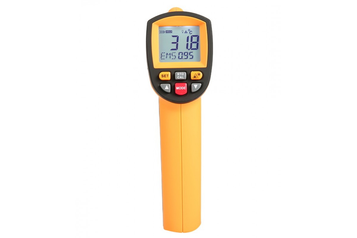 GM1500 безконтактний інфрачервоний термометр виробництва Benetech призначений для безконтактного вимірювання температури поверхонь. GM1500 забезпечує точне вимірювання температури в діапазоні від -30ºC до 1500ºC. Особливостями пірометра GM1500 є: розширений температурний діапазон, можливість встановлення коефіцієнта випромінювальної здатності, функція збереження та відтворення даних вимірювань, велика точність вимірювань, функції індикації низького заряду батареї та автоматичного вимкнення при тривалій бездіяльності приладу, підсвічування РК-дисплея та лазерний указ. Також GM1500 оснащений додатковою функцією утримування результатів вимірювання на дисплеї, функцією відображення максимального/мінімального/середнього значення та різниці значень температури поверхні, функцією вибору одиниць вимірювання, функція звукового попередження при досягненні встановлених значень температури.