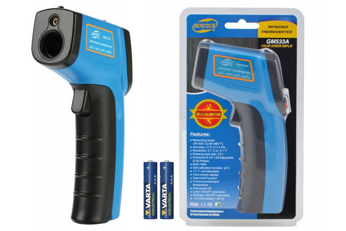 Пірометр GM533A виробництва компанії Benetech це оновлена модель GM550, що добре зарекомендував себе. Перевага нової моделі полягає в можливості вручну налаштовувати коефіцієнт EMS в діапазоні від 0,1 до 1,00. Що дозволяє значно розширити сферу застосування (наприклад тепер ви можете ефективно вимірювати матеріали з блискучими поверхнями - алюміній, бронзу, сталь та багато іншого, що раніше було не доступне для вимірювання). За рештою характеристик, а саме діапазон температур, робоча відстань, спектральний діапазон пірометр повністю повторює стару модель. Також дещо змінився дизайн. Пірометр GM550 мав корпус жовтого кольору, а нова модель GM533A – синього. Також дана модель має інвертований екран, що забезпечує велику економію енергії та зручність експлуатації. Пірометр GM533A як і раніше не можна вважати повною мірою професійним вимірювальним приладом, проте завдяки можливості вручну налаштовувати коефіцієнт EMS область застосування його значно розширилася: обстеження будинків на предмет пошуку ділянок із втратою тепла, кондитерська промисловість, вимірювання температури заморожених продуктів, вимірювання температури металів та багато інше.