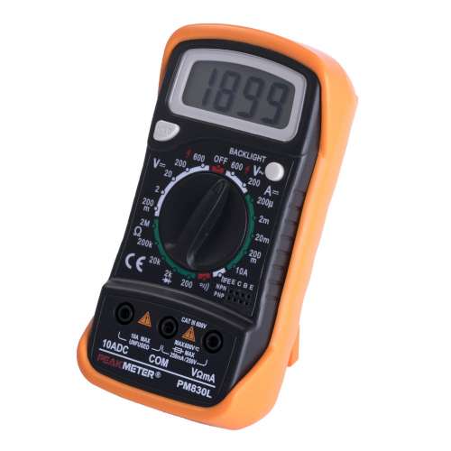 Мультиметр PROTESTER PM830L – це багатофункціональний пристрій для вимірювання різних параметрів електричних кіл. За своїми характеристиками мультиметр PM830L повністю збігається з моделлю PM830. Єдина відмінність – наявність у PM830L окремої кнопки увімкнення підсвічування екрану. Інші характеристики PM830L повністю збігаються: Вимір змінної та постійної напруги Вимір опору Тестування транзисторів Вимір постійного струму Перевірка та тестування ланцюга Тест діодів Мультиметр виконаний у прямокутному корпусі. Зверху на корпус одягнений захисний гумовий чохол. На передній поверхні розташований великий РК екран з яскравим підсвічуванням. Розрядність дисплея 2000 відліків. Під дисплеєм знаходяться кнопка утримання результату вимірювання та кнопка увімкнення підсвічування екрану. Нижче розташований великий круглий перемикач для вибору основних режимів та діапазонів вимірювання. Він легко перемикається та надійно фіксується. Всі написи та позначення якісні та легко читаються. Нижче наведено 4 входи для підключення щупів: Гніздо “VΩmA” Служить для підключення червоного щупа при вимірюваннях напруги, опору та струму до 200mA. Гніздо COM Служить для підключення чорного щупа. Гніздо “10A” Вимірює струм до 10А. Поряд із гніздами підключення щупів розташоване гніздо для перевірки транзисторів. На задній частині корпусу є відкидна ніжка, за допомогою якої можна мультиметр PM830 зручно поставити на робочому столі. Під ніжкою розташований відсік батареї для 1 батарейки типу крона. Щупи у мультиметра знімні. На гострих кінцях щупів є захисні ковпачки. Також у задній частині мультиметра є два пази, в яких для зручності можна зафіксувати вимірювальні щупи. Переносний мультиметр PM830 завдяки своїй зручності та багатому функціоналу може використовуватися як у польових умовах, так і в радіомайстернях та задовольнить потреби навіть найвибагливішого радіоаматора.