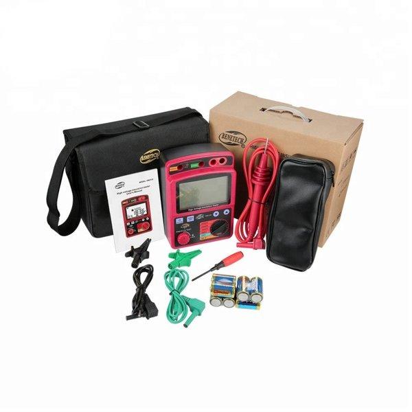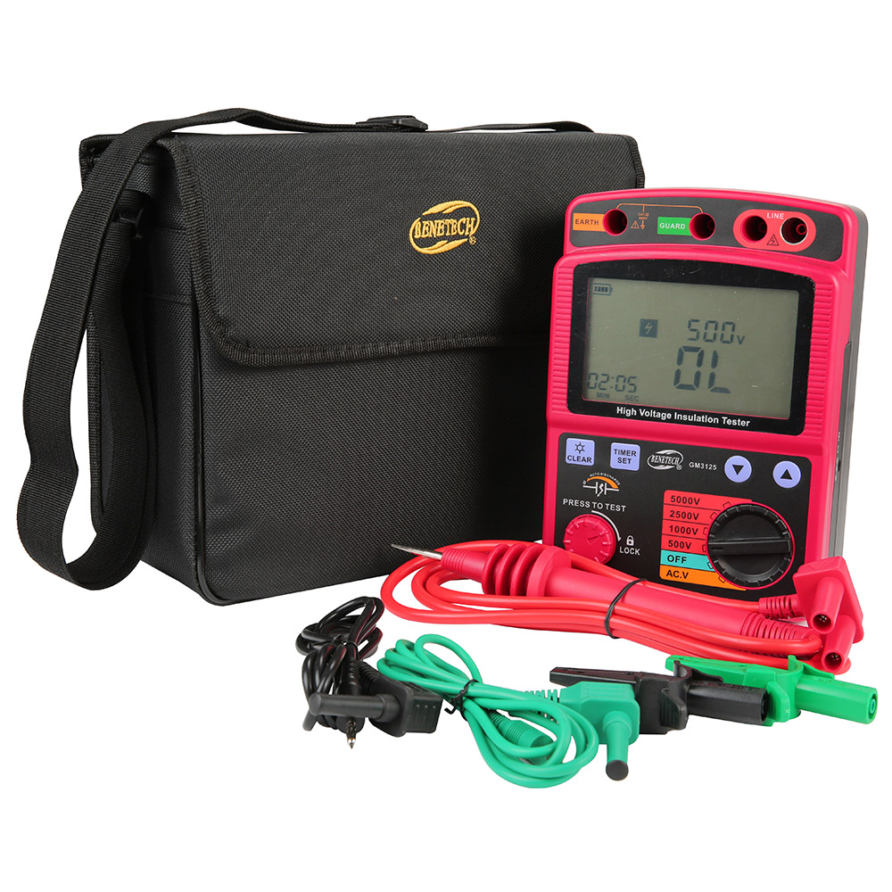 GM3125 – мегаомметр, вимірювач ізоляції виробництва компанії Benetech. Мегаомметр GM3125 призначений для вимірювання значень опору ізоляції. Тестова напруга від 500 до 5000, струм короткого замикання не вище 1,4 мА. У даному мегаомметрі реалізовані функції вимірювання змінної та постійної напруги до 600 Вольт. Особливістю даного вимірювача опору ізоляції є функція таймінгу для проведення тестування ізоляції та блокування кнопки тестування для запобігання випадковому запуску. Також варто відзначити наявність ручного вибору діапазону тестування і функцій індикації слабкого заряду батарей. ізоляції• Функція блокування кнопки тестування• Індикація недостатнього заряду батарей• Вимірювання напруги DCV/ACV до 600 В.• Цифровий дисплей з аналоговою шкалою