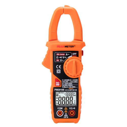 PM2018S - струмовимірювальні кліщі виробництва компанії PEAKMETER призначені для вимірювання змінного струму до 600A AC, напруги AC/DC до 600В, опору до 10 МОм, частоти до 1кГц, а також тестування цілісності ланцюга зі звуковою індикацією. Важливою особливістю струмових кліщів PM2018S є автоматичний вибір не тільки діапазону вимірювання, але і параметра, що вимірюється: напруга, опір або продзвонювання, тим самим виключається помилка вимірювання напруги в режимі опору. Токові кліщі PM2018S оснащені дисплеєм на 6000 відліків з подвійною індикацією, що дозволяє одночасно відображати відразу два параметри мережі. Безконтактний детектор високої напруги NVC підвищить безпеку застосування струмових кліщів, а функція детектування струмових піків від 1мс забезпечить захоплення струмових сплесків, наприклад, у момент пуску двигуна або інших перехідних процесів. Відмінність струмових кліщів PM2018S є не тільки високою роздільною здатністю 1мА, але й наявністю фільтра нижніх частот - LPF (1 кГц, 3дБ), призначення якого зниження впливу на результати вимірювання високочастотних перешкод. Для вимірювання пікових струмів реалізовано функцію PeakHOLD фіксуючу значення струму від 10А - 900А, тривалістю більше 1 мс, що цілком достатньо, щоб зафіксувати більшість перехідних процесів. Ключові особливості PM2018S: Автоматична ідентифікація напруги, струму, опору Фільтр нижніх частот (1кГц-3dB) Утримання даних Підсвічування Безконтактне виявлення напруги PMAX Низьковольтна інструкція Безперервність Автоматичне відключення Подвійний дисплей(Змінна напруга + частота 1,5В батарейок типорозміру ААА.