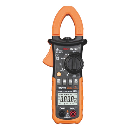 PM2108 – професійний високоточний прилад виробництва компанії PEAKMETER, який призначений для вимірювання змінного та постійного струму до 600A (у двох піддіапазонах: до 66 А та до 600А). Функціонал кліщів розширений такими додатковими функціями - вимірювання напруги, опору, частоти, ємності, тест діодів та тест провідності та ін. Для зручності проведення робіт у місцях з недостатньою освітленістю струмові кліщі PM2108 обладнані вбудованим ліхтариком, що підвищує безпеку проведення вимірювань. Перевагою струмовимірювальних кліщів PM2108 є функція TrueRMS – вимірювання сверднеквадратичного значення, що діє. ОСОБЛИВОСТІ PM2108 Функції вимірювань: постійний/змінний струм та напруга, ємність, опір, частота, коеф. заповнення імпульсів. Діаметр захоплення кліщів - 26 мм Функція утримання максимальних, мінімальних і поточних результатів вимірювання Вимірювання пускових струмів Функція продзвонювання ланцюга, тестування діодів Відповідність стандартам безпеки: CE CAT.III600V RoHS Корпус пристрою виготовлений зі зміцненого пластику з прогумованої поверхні компонентів від зовнішньої механічної дії. Живлення струмових кліщів від 3-х батарей, типорозміру ААА.