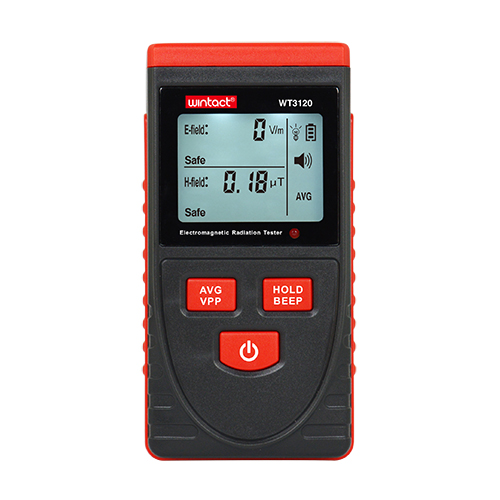 Детектор електромагнітного випромінювання WINTACT WT3120 – це прилад, який призначений для вимірювання параметрів електромагнітного поля. Електричне та магнітне поле - це складова частина електромагнітного випромінювання. Прилад є невеликою коробкою. На передній панелі розташований РК-екран. Під екраном знаходиться світлодіод червоного кольору, який спрацьовує при пікових показаннях приладу, сигналізуючи про небезпечне електромагнітне випромінювання. Ще нижче розташовані три кнопки управління: AVG/VPP – кнопка призначена для перемикання між середніми та максимальними показаннями приладу; HOLD/BEEP – призначена для утримання результату вимірювання та увімкнення/вимкнення звукового сигналу тривоги; Кнопка увімкнення/вимкнення приладу. Утримання цієї кнопки вмикає або вимикає детектор, а коротке натискання підсвічує екран. При включенні детектора верхня частина екрану показує напруженість електричного поля в В/м (Вольт/метр), нижня частина показує щільність потоку магнітної індукції в мктл (0,000001тл). Діапазон вимірювання детектора випромінювання від 1 до 1999 В/м при вимірюванні напруженості електричного поля та від 0,01 до 99,99 мктл при вимірюванні потоку магнітної індукції. Електромагнітні поля негативно впливають на організм людини, тому допустимі значення напруженості електричного поля та потоку магнітної індукції чітко регламентовані Всесвітньою організацією охорони здоров'я (ВООЗ). Детектор випромінювання WT3120 при показаннях більше 40 В/м та/або 0,4 мктл сигналізуватиме про небезпечне електромагнітне випромінювання.