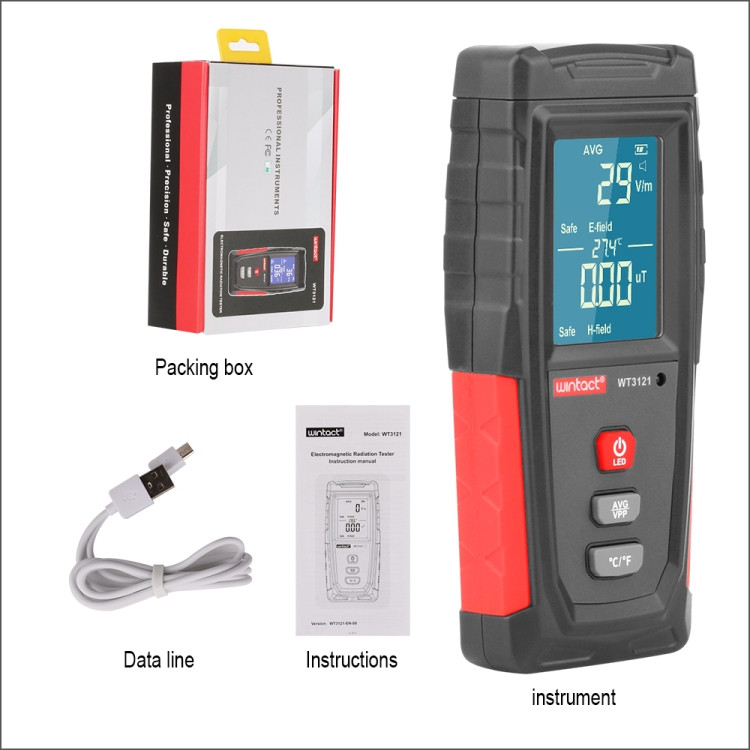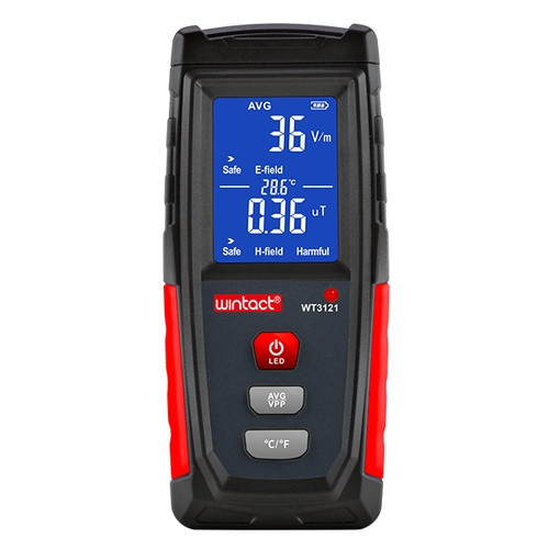 Вимірювач випромінювання WT3121 може тестувати випромінювання електричного поля та випромінювання магнітного поля. Він використовується для тестування та вивчення ситуації з електромагнітним випромінюванням у приміщенні та на вулиці. Прилад оснащений вбудованим датчиком електромагнітного випромінювання, який може відображати значення випромінювання цифрового РК-дисплея. Ви можете зробити розумну обробку або вжити ефективних заходів захисту від електромагнітного випромінювання відповідно до результатів тесту. Верхній показник на РК дисплеї - це електричне поле (низькочастотні випромінювання), що вимірюється в V/м, максимальні показання: - 1999V/м. Нижній показник - електромагнітне поле (високочастотне випромінювання), що вимірюється в µW/cm². Таке випромінювання здатні видавати мобільні телефони, комп'ютери, телевізори тощо. Максимальні показання – 99,9 μW/cm².