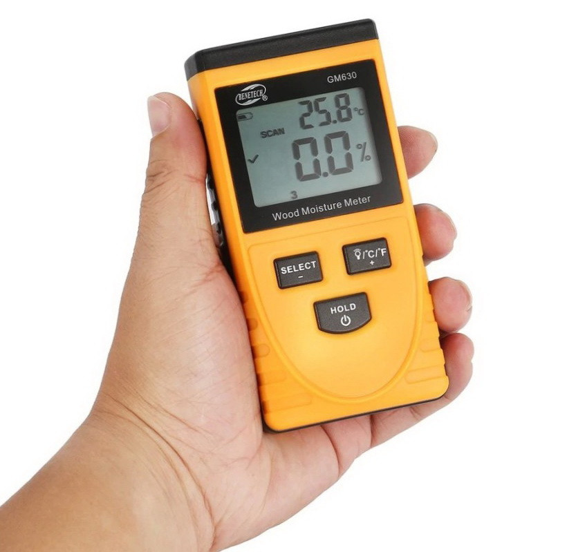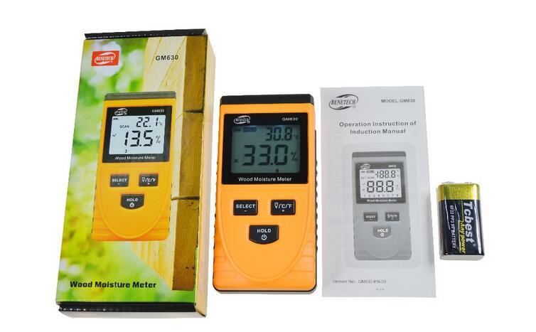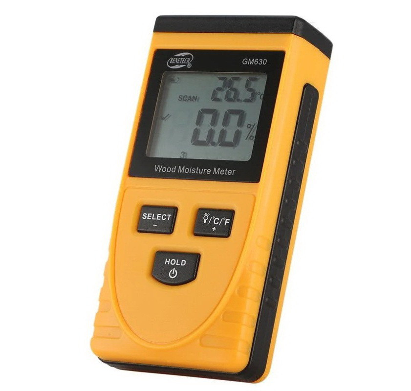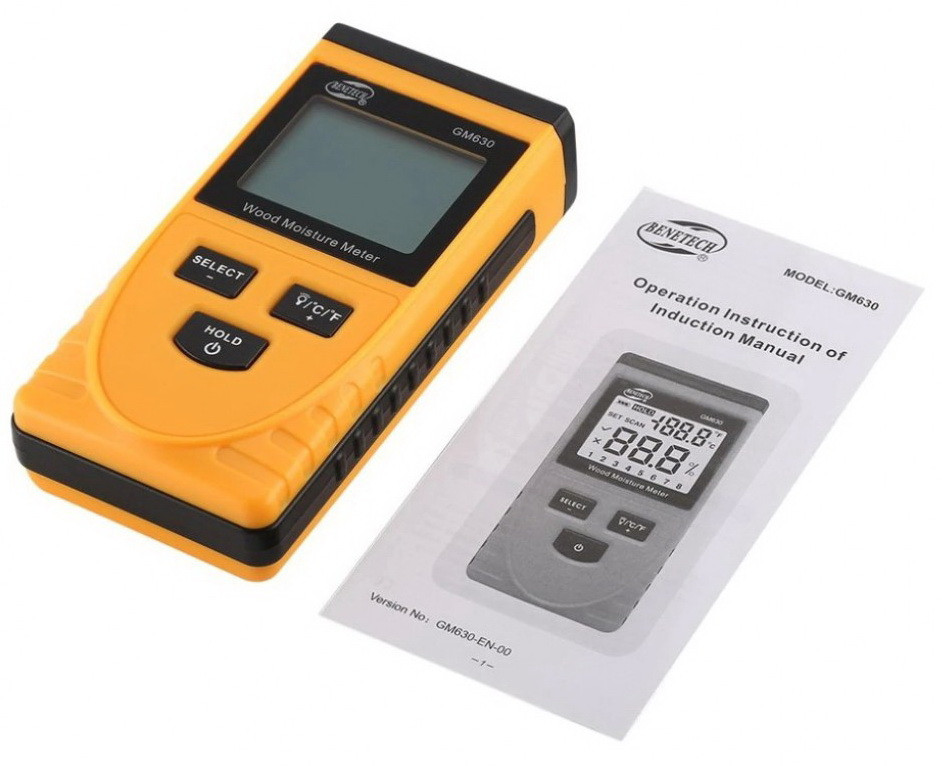 Широко застосовується у будівництві пристрій, що дозволяє виміряти вологість цегляної кладки, картону, деревини різних порід. Належить до безконтактних експрес-вимірювачів вологості. Його перевага – здатність аналізувати матеріал, не руйнуючи його. В основу роботи приладу покладено принцип проникнення електромагнітних сигналів у аналізовану поверхню. Цим експрес-вимірювач Benetech GM630 вигідно відрізняється від будь-якого голчастого вимірювача, тому що руйнуючий метод вимірювання використовувати не завжди зручно, особливо якщо йдеться про такі матеріали, як гіпсокартон, м'які та тверді сорти деревини, цегла або готові вироби, наприклад вже розкриті лаком ( віконні рами, двері, стільниці). Безконтактний експрес вимірник GM630 легкий, компактний та простий у використанні. Додаткова перевага даної моделі – вимірювання температури повітря у приміщення. Завдяки невеликому за розміром датчику ідеально підійде для вимірювання вологості у важкодоступних місцях та матеріалу, що має округлий переріз. Ця модель має 8 режимів вимірювання вологості деревини залежно від її щільності. Нижче наведено список порід деревини, що відповідають режимам вимірювання даного приладу. Щільність 0,27-0,38: тополя, ялина, американська липа; Щільність 0,38-0,45: ялиця, жовтий кедр, сосна звичайна, осика, бавовняне дерево, гібіскус, червона ялина; Щільність 0,45-0,55: верба, каштан; Щільність 0,55-0,65: Береза, ільм, червоний дуб, бук, ясен, горіх кешью; Щільність 0,65-0,75: Горіх, мербау, білий дуб, олива, деревина дерева тика; Щільність 0,75-0,85: ебонітове дерево; Щільність 0,85-0,95: Аспідіна; Щільність 0,95-1,05: червоне сандальне дерево, індійський птерокарпус, Південно-Азіатський птеракарпус.Вище наведений перелік не обмежує застосування безконтактного вологоміра Benetech GM 630-EN-00. Він налаштований не так на роботу з певними породами деревини, але в значення щільності. Тому якщо в інструкції до приладу Ви не знайшли ту породу деревини, вологість якої хочете померти, Вам слід знайти табличне значення густини деревини і вибрати той режим, який вам підходить.