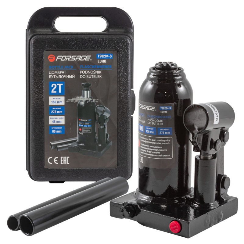 Домкрат гідравлічний пляшковий Forsage F-T90204S призначений для підйому вантажів масою до 2 т на висоту від 150 до 278 мм. Оптимальний для машин із великим кліренсом. Буде корисним автолюбителям під час проведення технічного обслуговування та ремонту авто у дорозі або в гаражі. Також домкрат підходить для напівпрофесійного застосування в станціях ТО. Переваги Захист від перевантаження – при перевищенні допустимої маси вантажу 2000 кг спрацьовує клапан безпеки. Широкий діапазон застосування – посилений гвинт дозволяє вручну збільшити висоту підйому на 80 мм. – завдяки трапецієподібному різьбленню збільшувальний гвинт витримує багаторазове використання. Захист від корозії – на корпус нанесено фосфатне покриття. Високоякісна всесезонна олія – домкрат безвідмовно працює в широкому діапазоні температур (від -20 до 45 ℃). чавунна станина забезпечує стійке положення домкрата, складова рукоятка дозволяє проводити роботи в обмеженому просторі та компактно розміщувати пристрій біля зони зберігання.