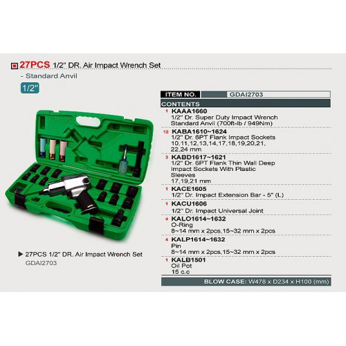 Набір пневмоінструменту TOPTUL GDAI2703 1/2" 27ед. Набір комплектується найпотужнішим пневмогайковертом KAAA1660 на приєднувальний квадрат 1/2 дюйма і зусиллям 949Нм. У наборі торцеве ударні головки від 10мм до 24мм, три шиномонтажні головки 17, 19, 21мм в спеціальній оплітці захищає колесо від подряпин. Також в комплекті подовжувач на 125мм і кардан для важкодоступних місць.