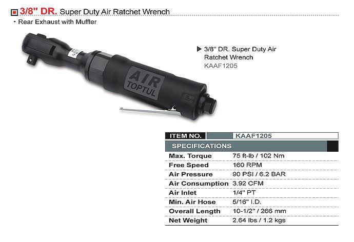 Тріскачка пневматична TOPTUL KAAF1205 приєднувальний квадрат 3/8", з максимальним створюваним зусиллям 102N/m, і швидкістю обертання 160об/хв mini, з висновком повітря із задньої частини і шумоглушників.