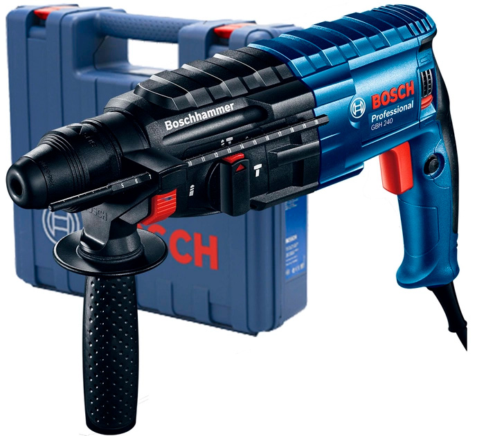 Bosch GBH 240 – потужний перфоратор для свердління та свердління з ударом отворів у бетоні, природному камені, цегляній кладці. Надійний інструмент з регулюванням оборотів та кількості ударів для оптимального використання з різними матеріалами поверхонь. особливо актуально при свердлінні з ударом;