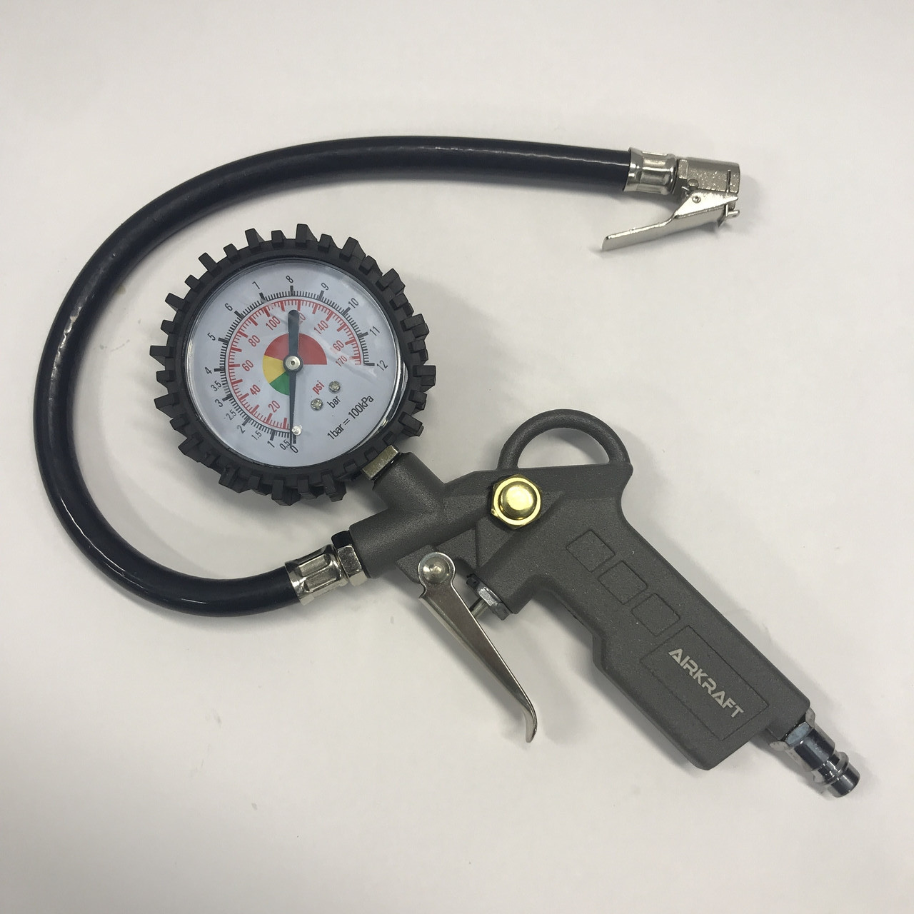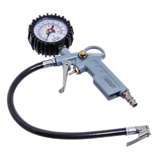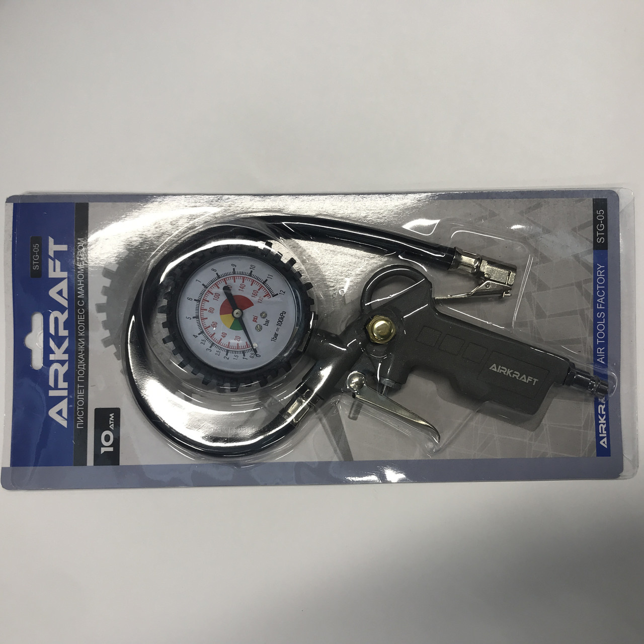Пистолет для подкачки колес с манометром (блистер) AIRKRAFT STG-05.Пистолет для подкачки шин необходимая вещь для подкачки, контроля и стравливания внутреннего давления в шинах автомобиля. Пистолет имеет встроенный манометр, диаметром 62 мм, циферблат которого позволяет комфортно считывать показатели давления в диапазоне до 10 Атм. При подключении пистолета к внешнему источнику сжатого воздуха, максимальное рабочее давление не должно превышать 10кгс/см²(10bar). Поверхность манометра изготовленная из противоударного пластика, для защиты от механических повреждений. Корпус выполнен из стали, высокого качества, что обеспечит длительный срок службы. Металлическая эргономическая ручка, которая хорошо сидит в руке. Резиновый шлаг, диаметром 10 мм, позволяет присоединить пистолет к ниппелю в любом положении колеса. За счет быстросъемного соединителя, размер входа воздуха 1/4", можно быстро и легко присоединится к источнику подачи сжатого воздуха. Данный пистолет, нашел широкое применение не только автомастерских, шиномонтаже но и на высокоточном производстве.