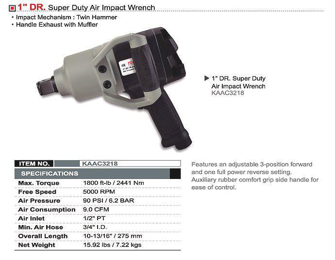Пневмогайковерт TOPTUL KAAC3218 1" належить до класу потужних ударних пневматичних інструментів. Корпус гайковерта виконаний з композитного матеріалу і важить 7,22 кг. Пневмогайковерт виконаний з двома ручками для простоти управління. А так само для комфортної роботи і безпеки майстра кнопка пуску захована у внутрішню частину рукоятки, що б при тривалій роботі пневмогайковерт не вислизав з рук, прогумовані рукоятки. Максимальне зусилля створюване пневматичним гайковертом становить 2441 Н/м, а витрата повітря 255 л/хв.