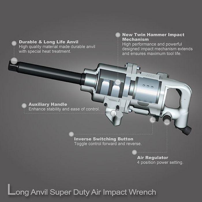 Пневмогайковерт TOPTUL KAAB3225 (подовжений шпиндель) 1" належить до класу потужних ударних пневматичних інструментів. Корпус гайковерта виконаний з композитного матеріалу і важить 16.8 кг. Пневмогайковерт виконаний з двома ручками для простоти управління. А так само для комфортної роботи і безпеки майстра кнопка пуску захована у внутрішню частину рукоятки. Максимальне зусилля створюване пневматичним гайковертом складає 3390 Н/м,
