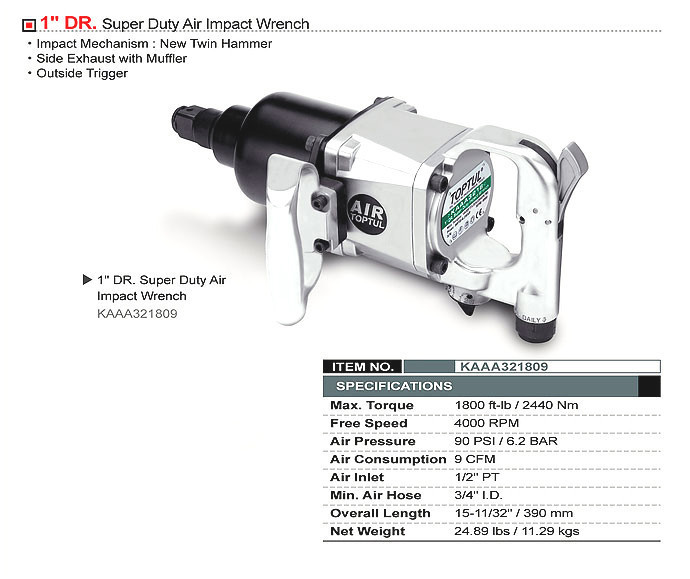 Пневмогайковерт TOPTUL KAAA321809 1" належить до класу потужних ударних пневматичних інструментів. Корпус гайковерта виконаний з композитного матеріалу і важить 11,29 кг. Пневмогайковерт виконаний з двома ручками для простоти управління. Кнопка включення винесена назовні. Максимальне зусилля створюване пневматичним гайковертом складає 2440 Н/м.
