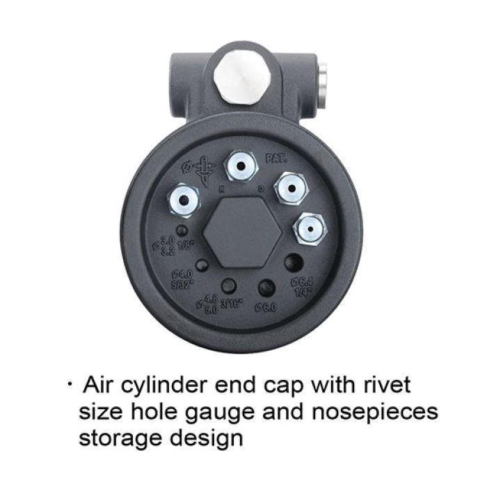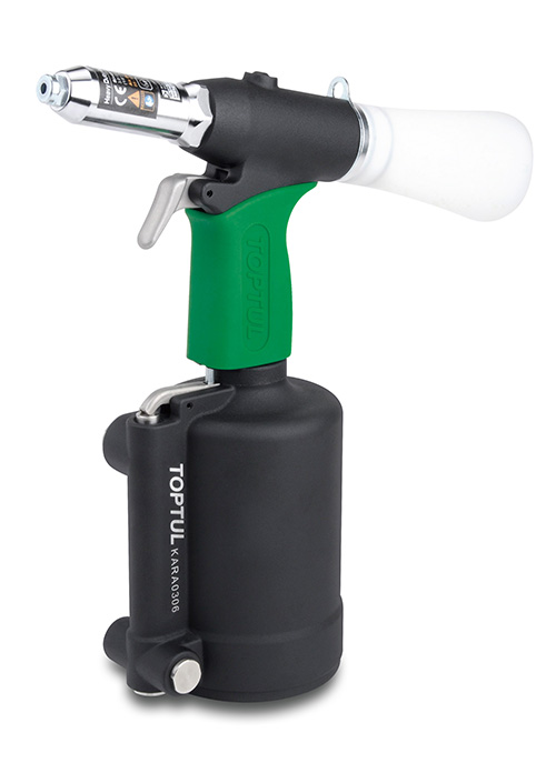 Пневмогідравлічний заклепочник для витяжних заклепок TOPTUL 3.0-6.4 мм KARA0306. Підходить для заклепок з алюмінію / сталі і неіржавіючої сталі. Призначений для професійної клепки і безперервної роботи. Конструкція з подвійним повітрозабірником дозволяє легко працювати з правою або лівою рукою. Новий використаний контейнер з оправою для захисту очей оператора і підтримання робочих місць у чистоті. Конструкція амортизатора для мінімізації втоми рук. Шумоглушник для зручності. Розумна конструкція наконечника, щоб уникнути втрати заклепок. Конструкція отвори для заправки масла для швидкого заповнення запасу гідравлічного масла. Комплект включає в себе складальник оправки заклепок, два комбінаційних ключа, кисть, гідравлічний інжектор масла без масла і один комплект додаткових щелеп.