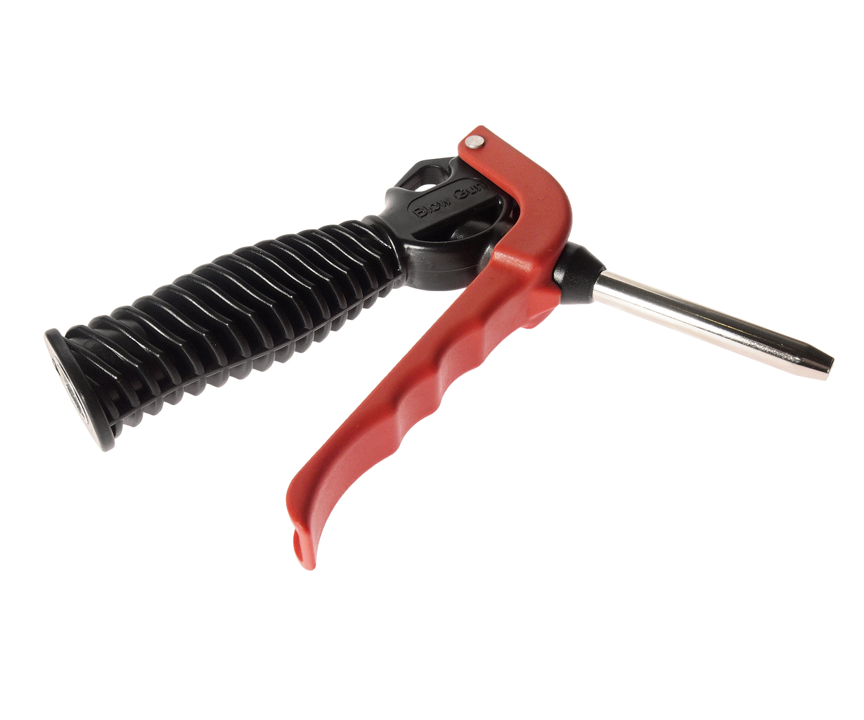 Трубка 8 мм. і конусовидний вихідний отвір забезпечують оптимальний потік повітря для продування. З ергономічною вичавною рукояткою для економії зусилля та металевим перехідником у місці підключення повітряного штуцера. Робочий тиск: 15 кг/см3. Витрата повітря: 120 л/хв, при 150 psi. Вихідний отвір трубки: конічний. Довжина трубки: 50 мм. Вхідний отвір: 1/4.