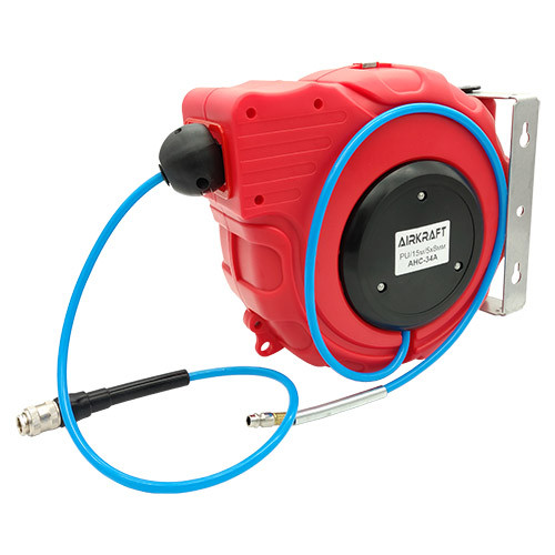 Настенная автоматическая катушка для пневматического шланга AIRKRAFT AHC-34A, используемая вместе с пневматическими инструментами.