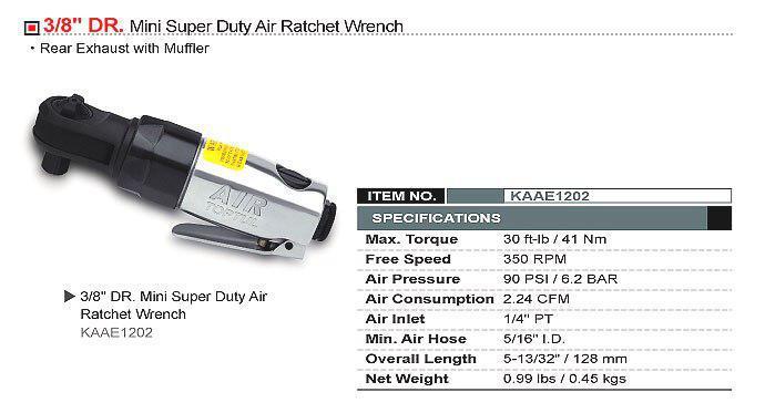 Тріскачка пневматична TOPTUL KAAE1202 приєднувальний квадрат 3/8", з максимальним створюваним зусиллям 41N/m, і швидкістю обертання 360об/хв mini, з висновком повітря задньою частиною і шумоглушників.