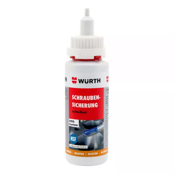 Фіксатор / герметик для різьбових з'єднань, середньої міцності з системою дозування однією рукою. Забезпечує з'єднання середньої міцності. Видаляється звичайними інструментами. Може використовуватися навіть на нержавіючій сталі і пасивованих поверхнях. Не вимагає застосування додаткових прискорювачів або активаторів. Висока термічна та хімічна стійкість. Універсальний засіб з широкою сферою застосування. Запобігає ослабленню з'єднання, викликаному, наприклад, вібрацією або ударними навантаженнями. Міцність з'єднання рівноцінна механічному кріпленню. Висока стійкість. Стійкість до різних лугів, газів, розчинників, олив і палива. Не містить силікону. Система DOS: Можлива робота однією рукою завдяки спеціальній системі закриття флакона (одна рука завжди вільна). Система рівномірного дозування. Розпилення можна регулювати відповідно до конкретних потреб. Таким чином, скорочується витрата фіксатора, а отже, і витрати на нього. Носик не забивається. Оптимізація витрат завдяки повній витраті матеріалу. Примітка При тривалому контакті можливий негативний вплив на такі матеріали: ABS, целулоїд, полістирол, полікарбонат (Macrolon), PMMA (плексиглас), полісульфон, полістиролакрилонітрил, Vinidur, вулканізовані волокна і пофарбовані поверхні. Перед використанням рекомендується провести тест на сумісність. Сертифікат відповідності Протестований NSF на відповідність вимогам стандарту NSF ANSI 61, DVGW (Німецька науково-технічна асоціація водо- і газопостачання) (DIN EN 751-1).
