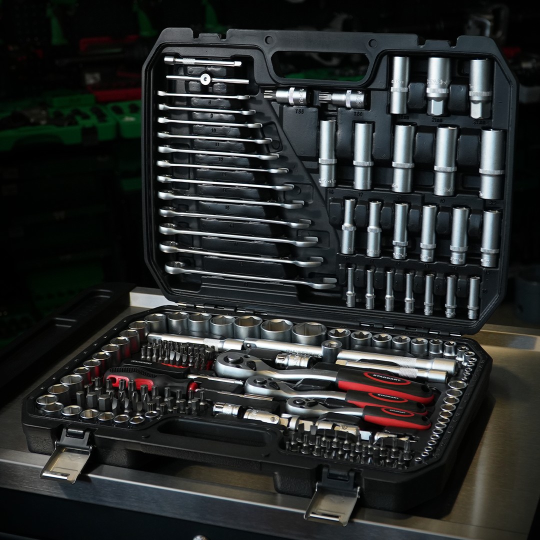 1 шт.: 1/4’’ Тріскачка 72 зубця 1 шт.: 3/8’’ Тріскачка 72 зубця 1 шт.: 1/2’’ Тріскачка 72 зубця 1 шт.: 1/4’’ Вороток з плаваючою головкою 1 шт.: 1/2’’ Вороток з плаваючою головкою 2 шт.: 1/4’’ Подовжувачі 50, 100 мм 2 шт.: 3/8’’ Подовжувачі 125 мм 2 шт.: 1/2’’ Подовжувачі 125, 250 мм 1 шт.: 1/4’’ Кардан 1 шт.: 3/8’’ Кардан 1 шт.: 1/2’’ Кардан 1/4’’ Торцеві головки 13 шт.: 4, 4.5, 5, 5.5, 6, 7, 8, 9, 10, 11, 12, 13,14 мм 5 шт.: E4, E5, E6, E7, E8 3/8’’ Торцеві головки 10 шт.: 10, 11, 12, 13, 14, 15, 16, 17, 18, 19 мм 6 шт.: E10, E11, E12, E14, E16, E18 1/2’’ Торцеві головки 14 шт.: 13, 14, 15, 16, 17, 18, 19, 20, 21, 22, 24, 27, 30, 32 мм 3 шт.: E20, E22, E24 1/4’’ Торцеві головки подовжені 7 шт.: 4, 5, 6, 7, 8, 9, 10 мм 3/8’’ Торцеві головки подовжені 6 шт.: 10, 11, 12, 13, 14, 15 мм 1/2’’ Торцеві головки подовжені 5 шт.: 16, 17, 18, 19, 22 мм