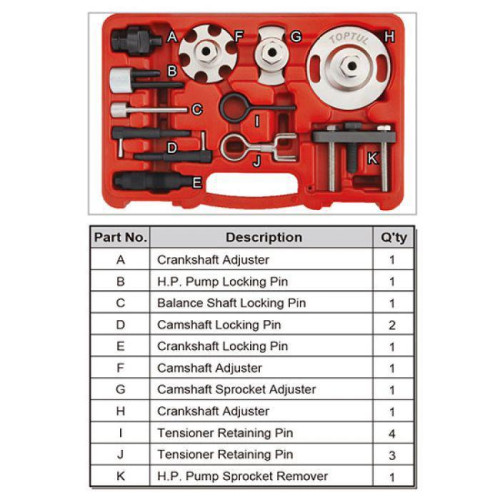 Набір фіксаторів розподільних валів та колінвалів VW/Audi Diesel Engine 12ед. TOPTUL JGAI1203. Спеціальний набір інструментів для регулювання і фіксації ланцюга привода газорозподілу на дизельних двигунах VW/AUDI. Підходить для розміщення валів двигуна, таких як розподільчі вали, вали насоса вприскування та колінчасті вали.