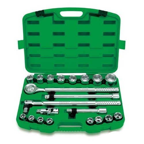 У даний набір включені: 16 торцевих 6-гранних головок від 19 до 50 мм, два подовжувача з фіксацією розміром 200 і 400 мм, кардан, комірець з шарніром з фіксацією і тріскачка на 24 зубця з подовжувачем 500мм.