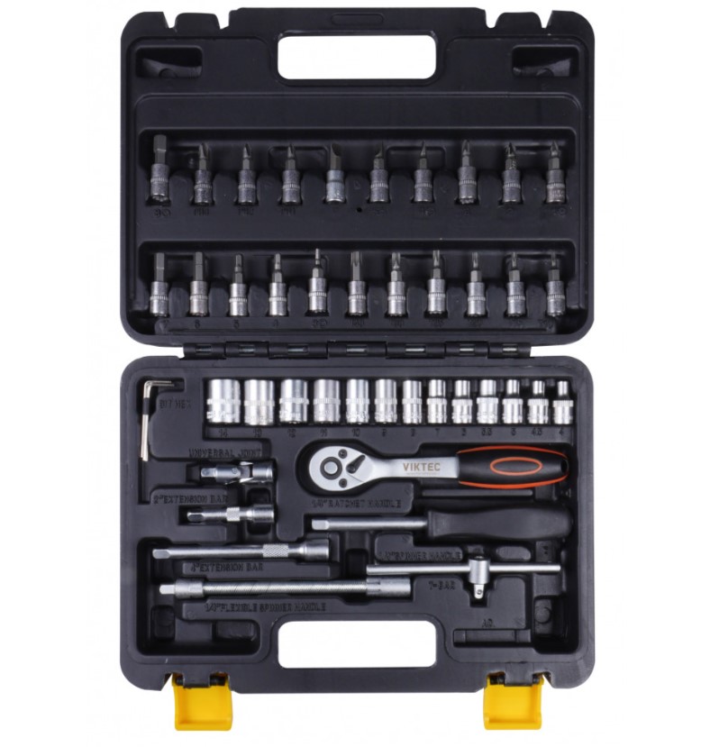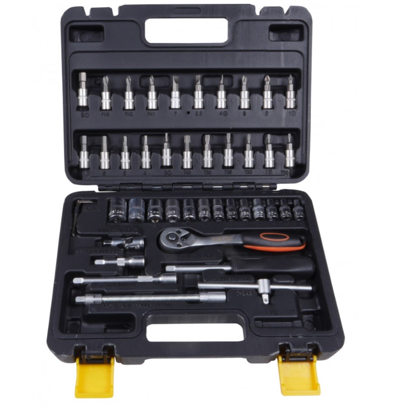 Комплектація: Головка торцева 6-гр 1/4; 4, 4.5, 5, 5.5, 6, 7, 8, 9, 10, 11, 12, 13, 14мм. Насадки TORX: T10, T15, T20, T25, T30, T40. Насадки PH: PH1, PH2, PH3. Насадки PZ: PZ1, PZ2, PZ3. Насадки SL: SL4, SL5.5, SL7 HEX насадки: H3, H4, H5, H6, H7, H8. Карданний перехідник 1/4; Тріскачка 72зубця. Вороток із плаваючою головкою 115мм. Гнучкий подовжувач 1/4; Вороток 1/4; Адаптер. Ключ шестигранний Г-подібний.