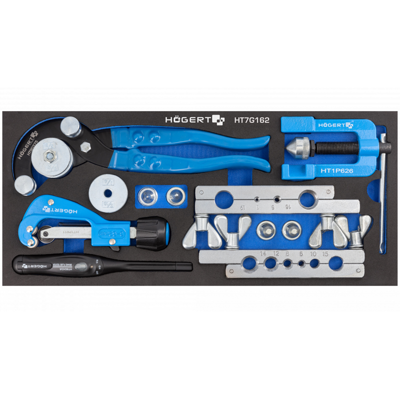 Опис продукту Вкладиш для інструментальних шаф із набором підібраних інструментів, необхідних для роботи в майстерні з трубками гальмівної системи. Інструменти корисні для кожного професіонала. Властивості • прес для ручного розвальцювання труб в діапазоні від 3 до 19 мм зі сталі, кольорових металів, алюмінію та міді; • труборіз для труб діаметром від 3 до 32 мм, виготовлених із міді, алюмінію чи пластмаси, напр. ПВХ, ПУ, ПП, PEX-AL, PEX; • ручний тестер, який призначений для перевірки якості гальмівної рідини ДОТ-3, ДОТ-4, ДОТ-5; • трубогиб з 2 роликами, необхідний для згинання гальмівних шлангів діаметром в межах 4,75-9,53 мм; • технічна піна EVA допомагає підтримувати чистоту на робочому місці, забезпечуючи легкість та зручний доступ до часто використовуваних інструментів.