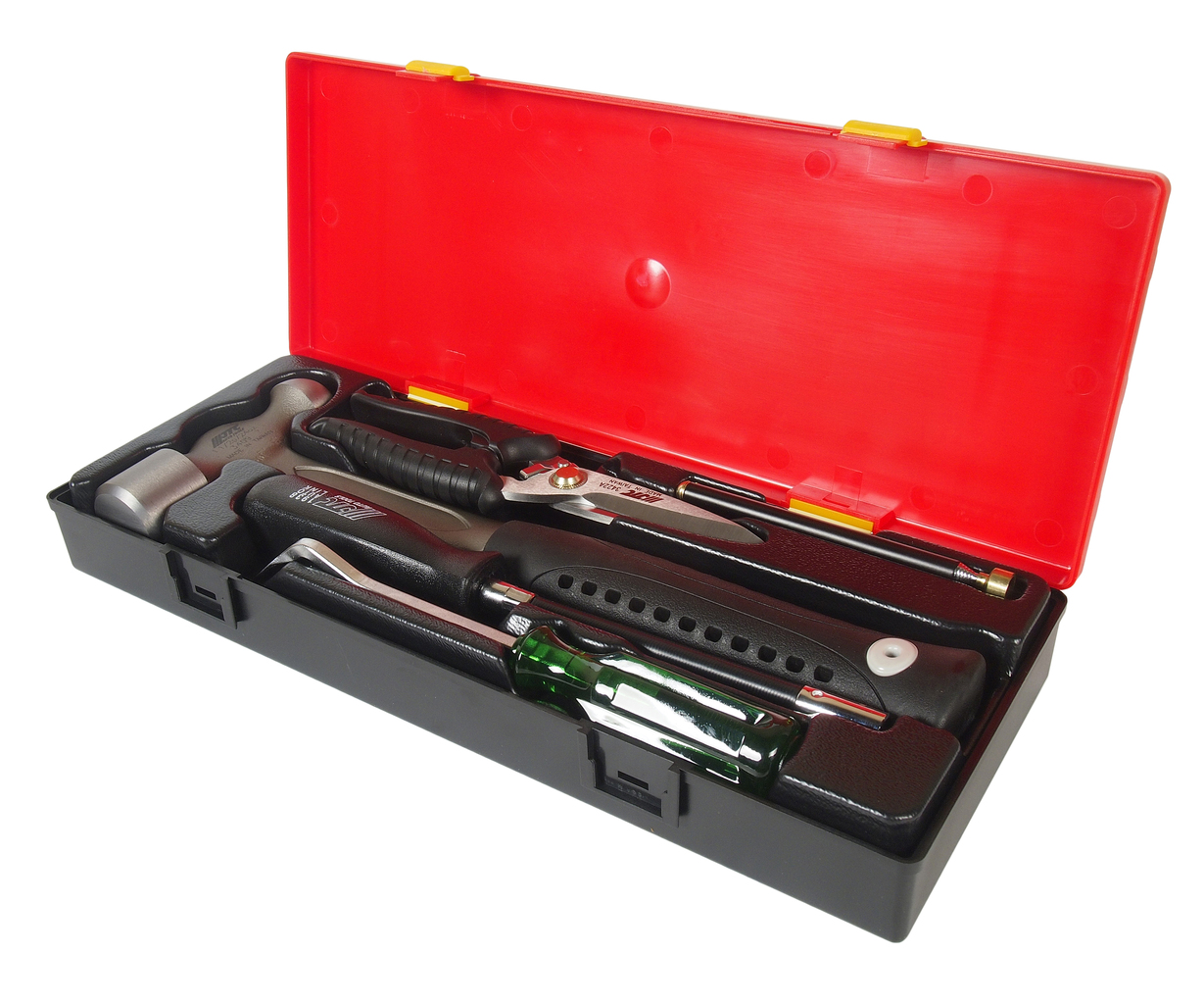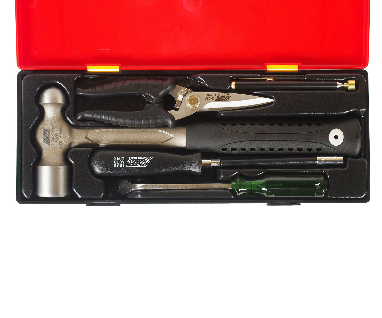 Опис У комплекті: JTC-3409: металевий молоток 1-1/2Р - 1 шт. JTC-3422А: ножиці 8-1 шт. JTC-3511: магнітний утримувач 3.5LBS - 1 шт. JTC-19387: торцева викрутка з гнучким стрижнем 7 мм. - 1 шт. JTC-2511: знімач для кліпс - 1 шт. Загальна кількість предметів: 5 шт. Комплект упакований у міцний презентабельний бокс. Габаритні розміри: 375/140/60 мм. (Д/Ш/В) Вага: 1910 гр.