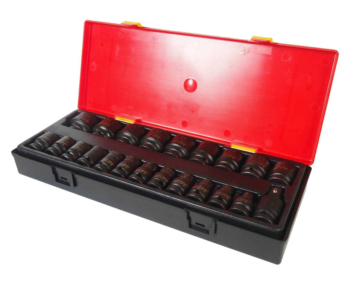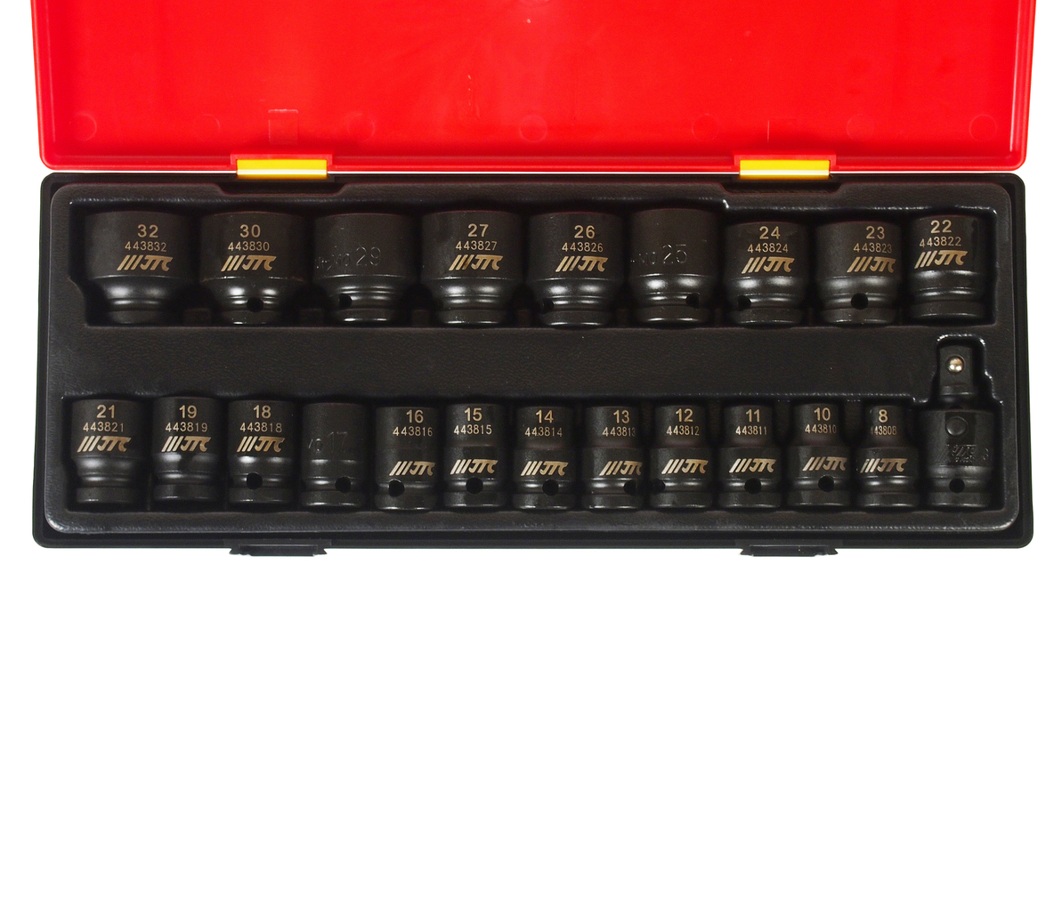Опис У комплекті: Артикули JTC-43908-32: 6-гранні: 8, 10, 11, 12, 13, 14, 15, 16, 17, 18, 19, 21, 22, 23, 24, 25, 26, 27 , 29, 30, 32 мм. - 21 шт. JTC-3703: перехідник ударний 1/2-1 шт. Квадрат приєднання 1/2; Загальна кількість предметів: 22 шт. Комплект упакований у міцний презентабельний бокс.