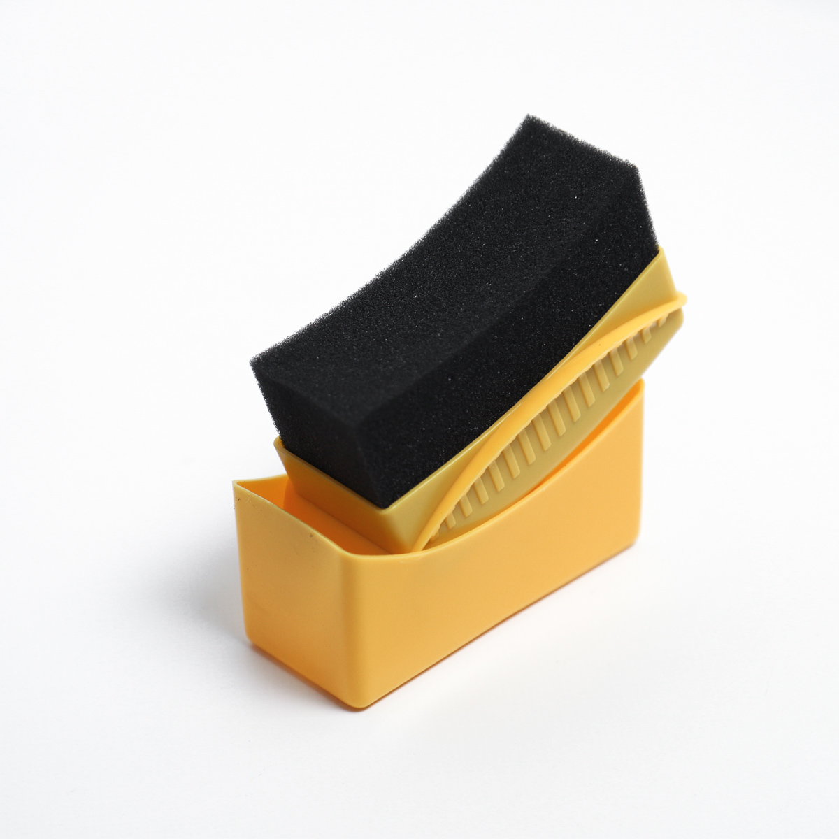 Поролоновий аплікатор для нанесення захисних засобів на шини. Головна перевага— хімостікість (властивість «дружити» з хімією та не розпадатися від її впливу). Зручно лежить в руці завдяки спеціальному утримувачу. Не бруднить руки при використанні. Кришка захищає аплікатор від пересихання та забруднення пилом. Поролоновий аплікатор з пластиковою ручкою. Зручний для нанесення засобів захисту і гелів. Тип: Засоби для шин Колір: Жовтий Метод: Ручний Матеріал: Поролон