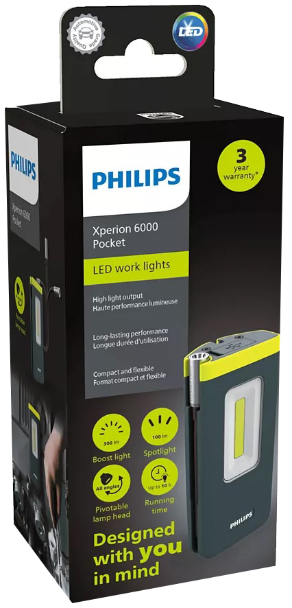Philips Xperion 6000 Pocket має потужне джерело світла та гнучку ручку завдовжки 25 см для освітлення важкодоступних місць. Вузька й компактна конструкція надзвичайно зручна для роботи в обмеженому просторі. Покладіть Philips Xperion 6000 Pocket у кишеню та використовуйте для різноманітних потреб.