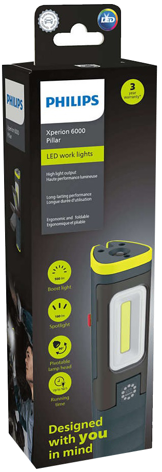 Philips Xperion 6000 Pillar працює весь день на одному заряді акумулятора. Із двома режимами інтенсивності основного світла (250 та 500 лм) і вбудованим ліхтарем (180 лм) він стане незамінним помічником у найрізноманітніших ситуаціях. Легко складається для перенесення й регулювання кута освітлення.